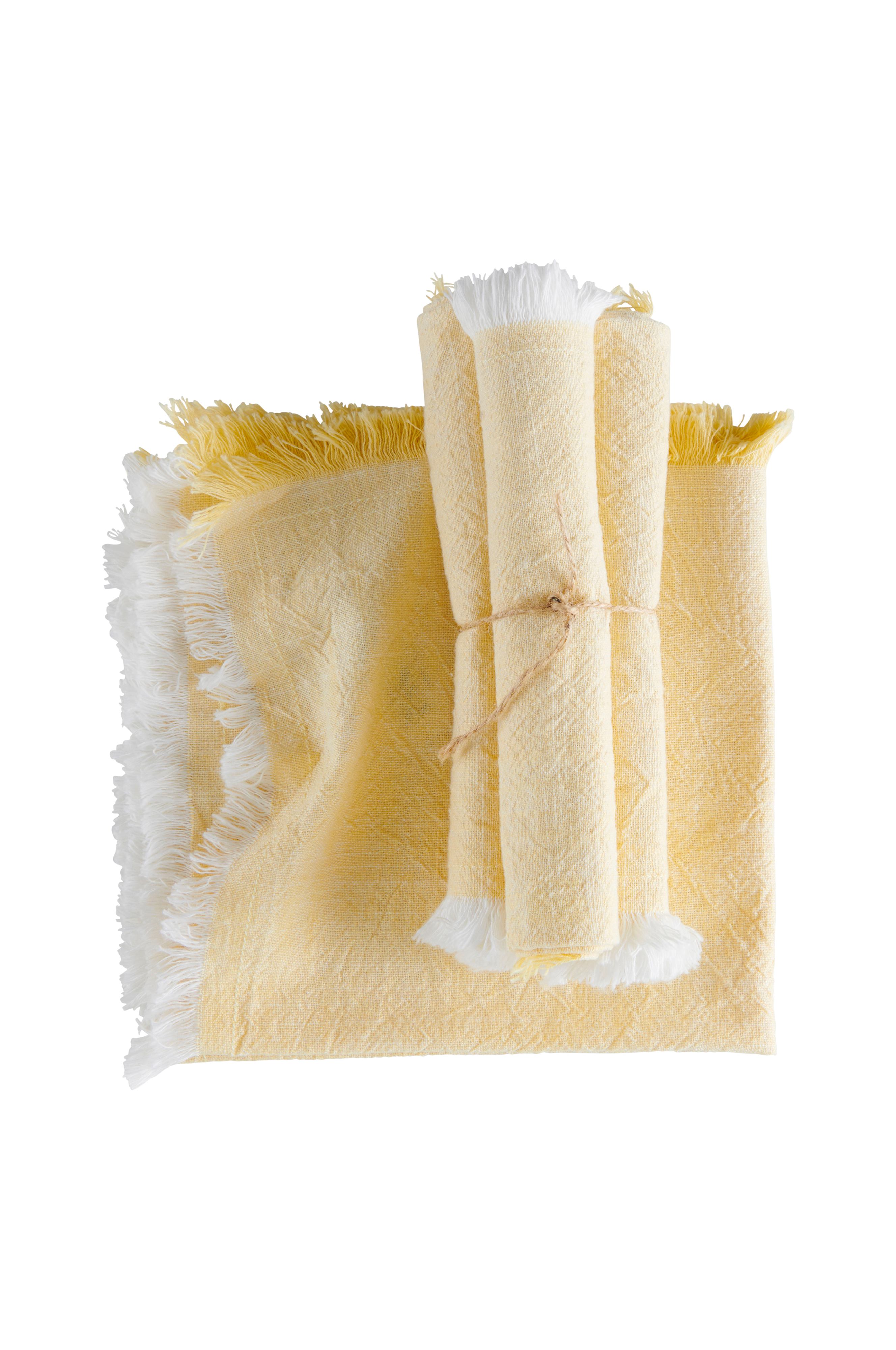 4 servietter i vevd, økologisk bomull med melert farge og slubbeffekt, noe som betyr at stoffet har en lett tekstur. Frynser på 4 sider.