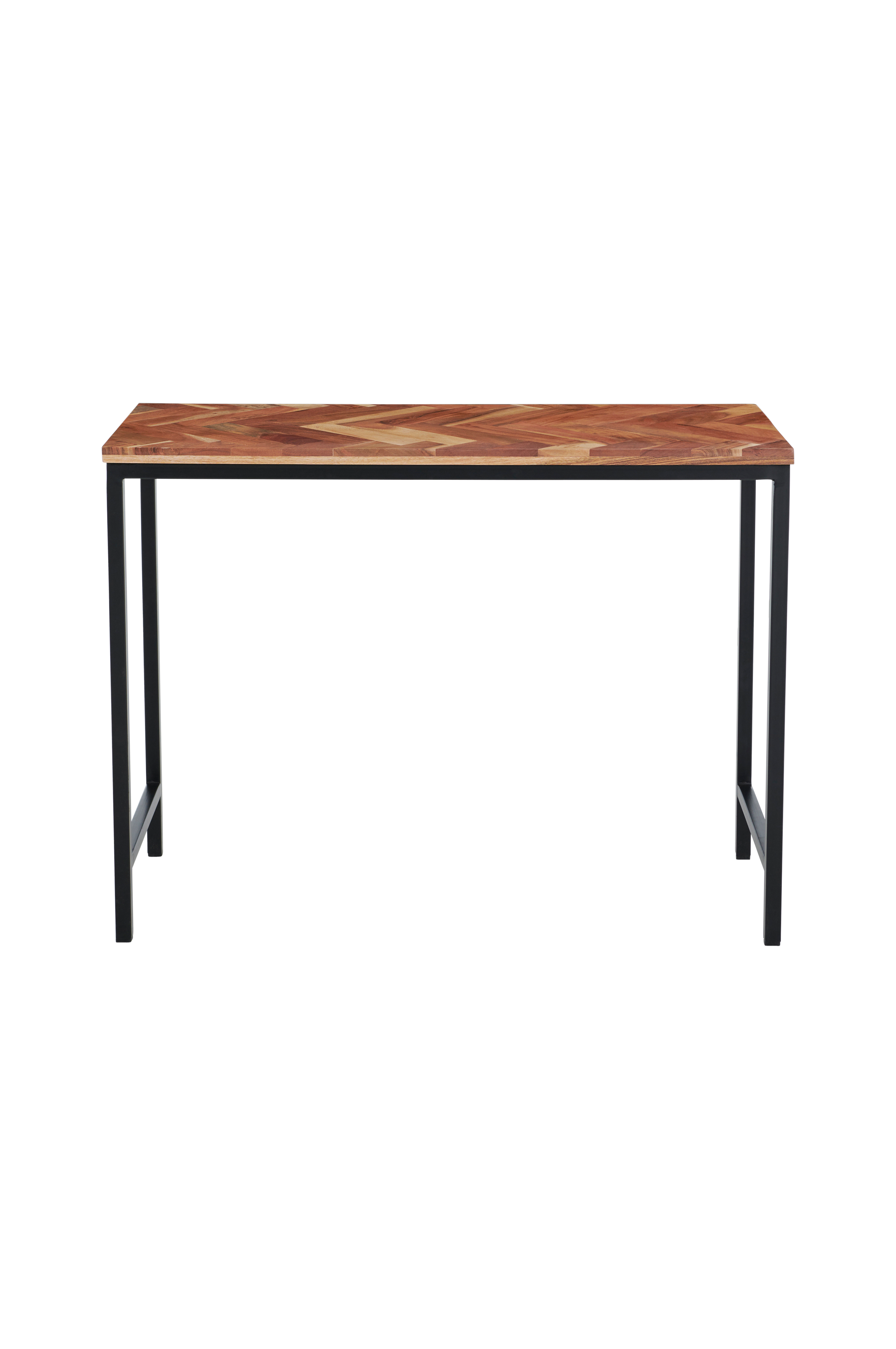 Sidebord med ben av pulverlakkert metall. Topplate av massivt akasietre med fiskebensmønster. Høyde fra gulv til nederkant 75 cm.