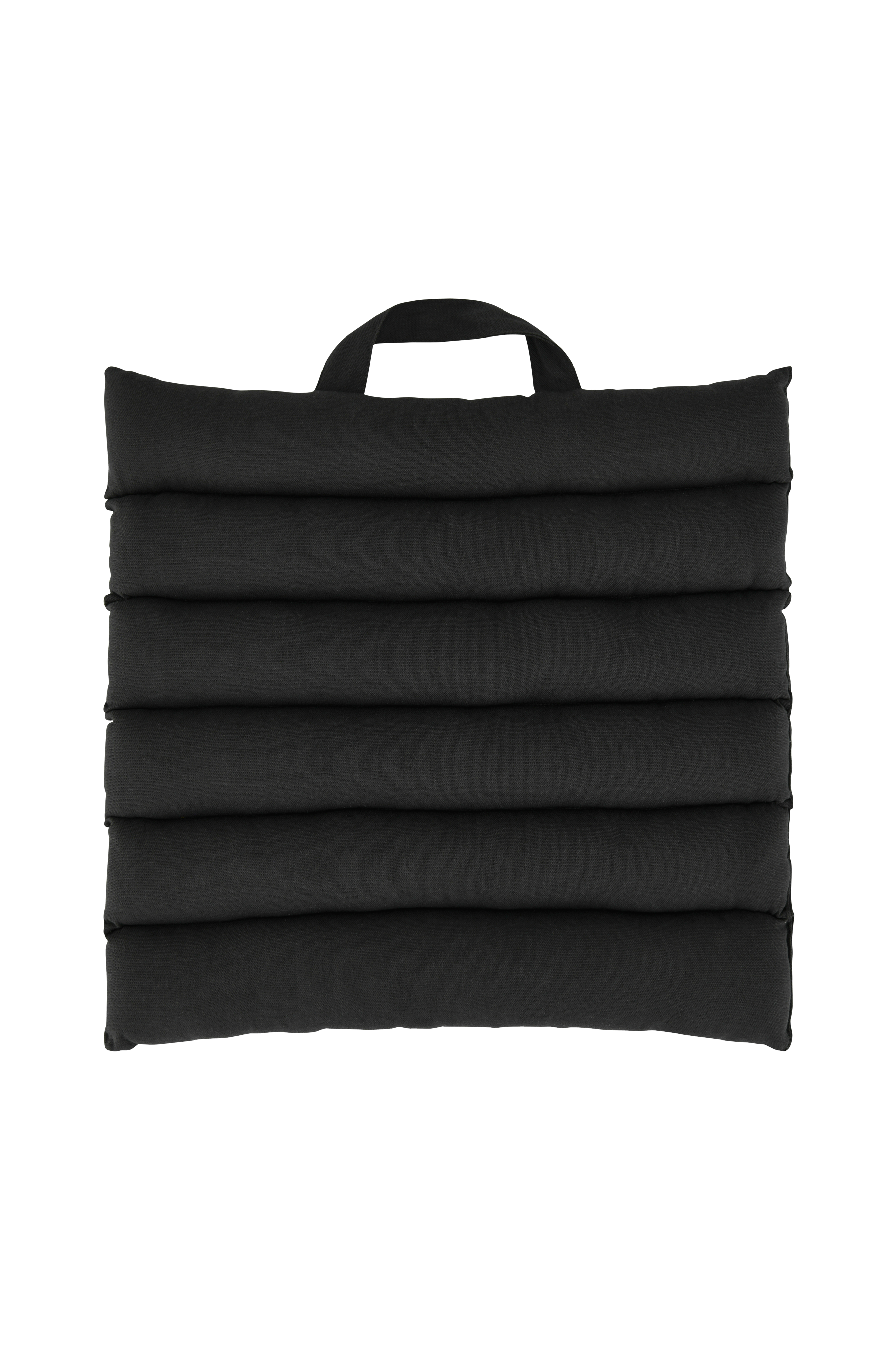 Sittepute i bomull med sydde kanaler. Håndtak på den ene kortsiden. Fyll av gjenvunnet polyester. Str 45x45 cm. Tykkelse 3 cm.