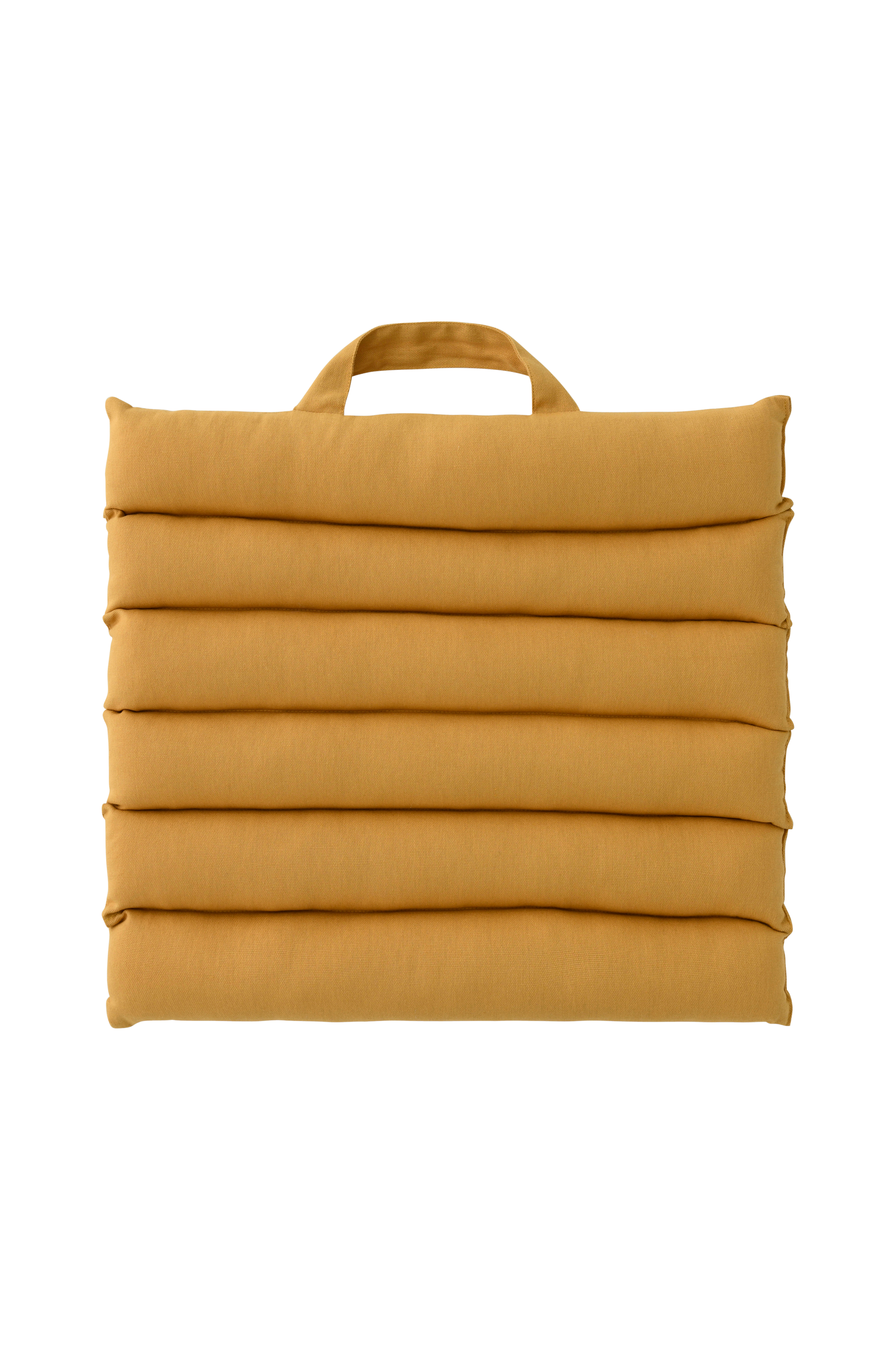 Sittepute i bomull med sydde kanaler. Håndtak på den ene kortsiden. Fyll av gjenvunnet polyester. Str 45x45 cm. Tykkelse 3 cm.