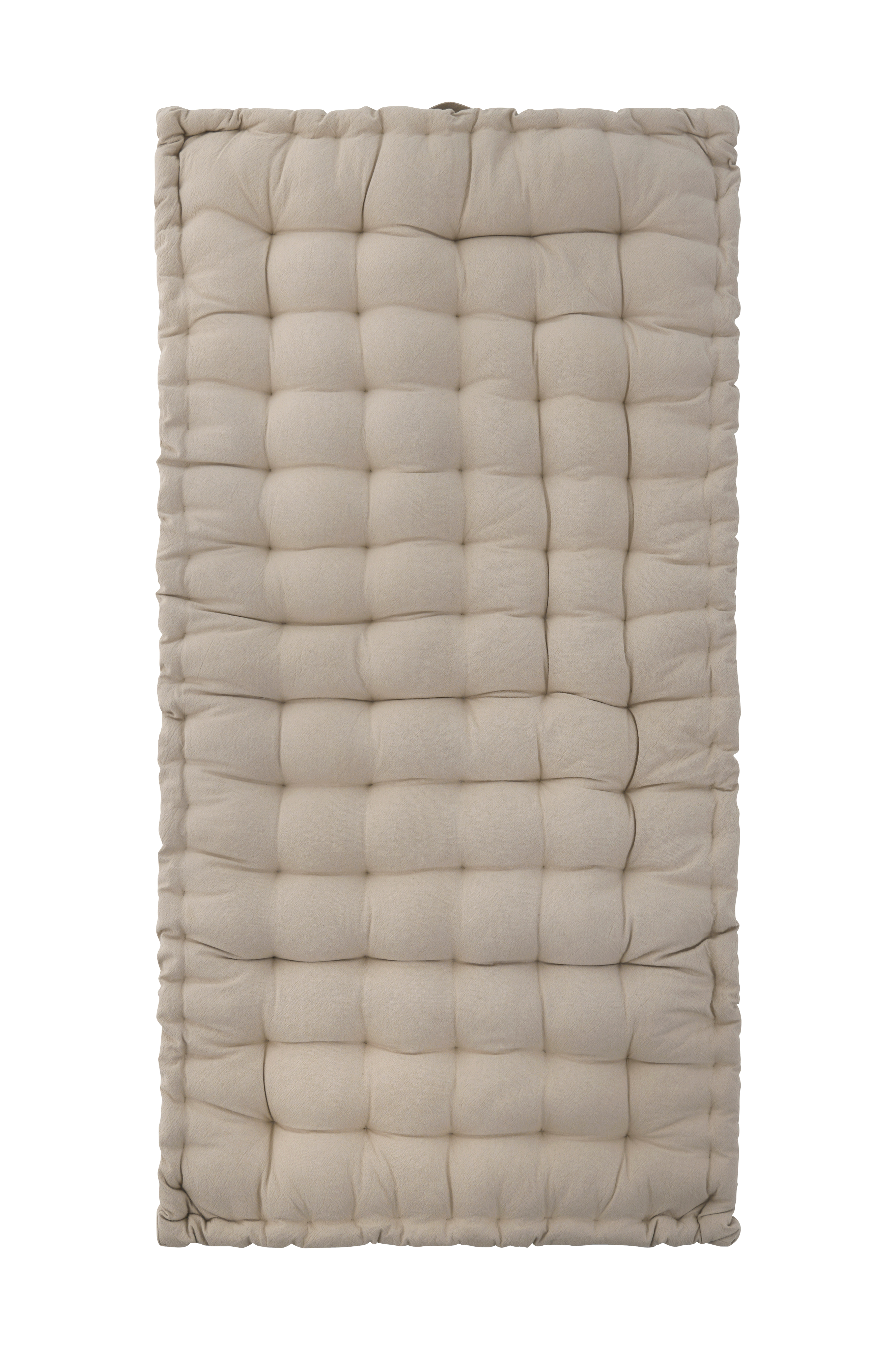 Sittepute i boksmodell med trekk av bomull med vasket finish. Dekorative, håndsydde sting. Håndtak på den ene siden. Fyll av gjenvunnet polyester. Str 70x150 cm. Tykkelse 5 cm.