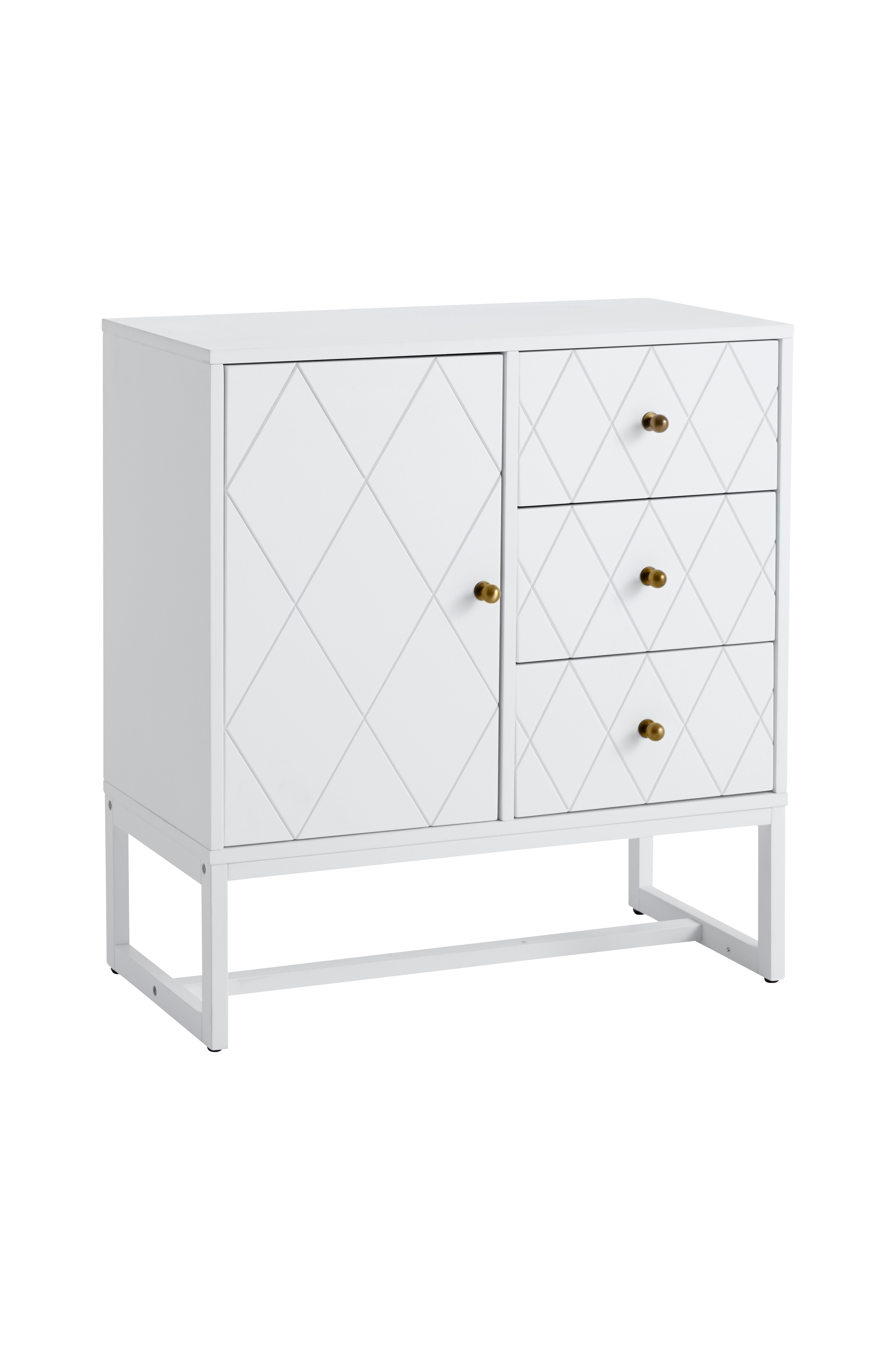 Dekorativt skap av MDF med frest mønster. Ben av tre. 3 skuffer med stoppere og et skap med ett fast hylleplan. Beslag i antikkmessingfarget metall. Mål: 70x35 cm. Høyde 76 cm. Høyde fra gulvet til skapets nederkant ca. 18,5 cm. Leveres umontert.