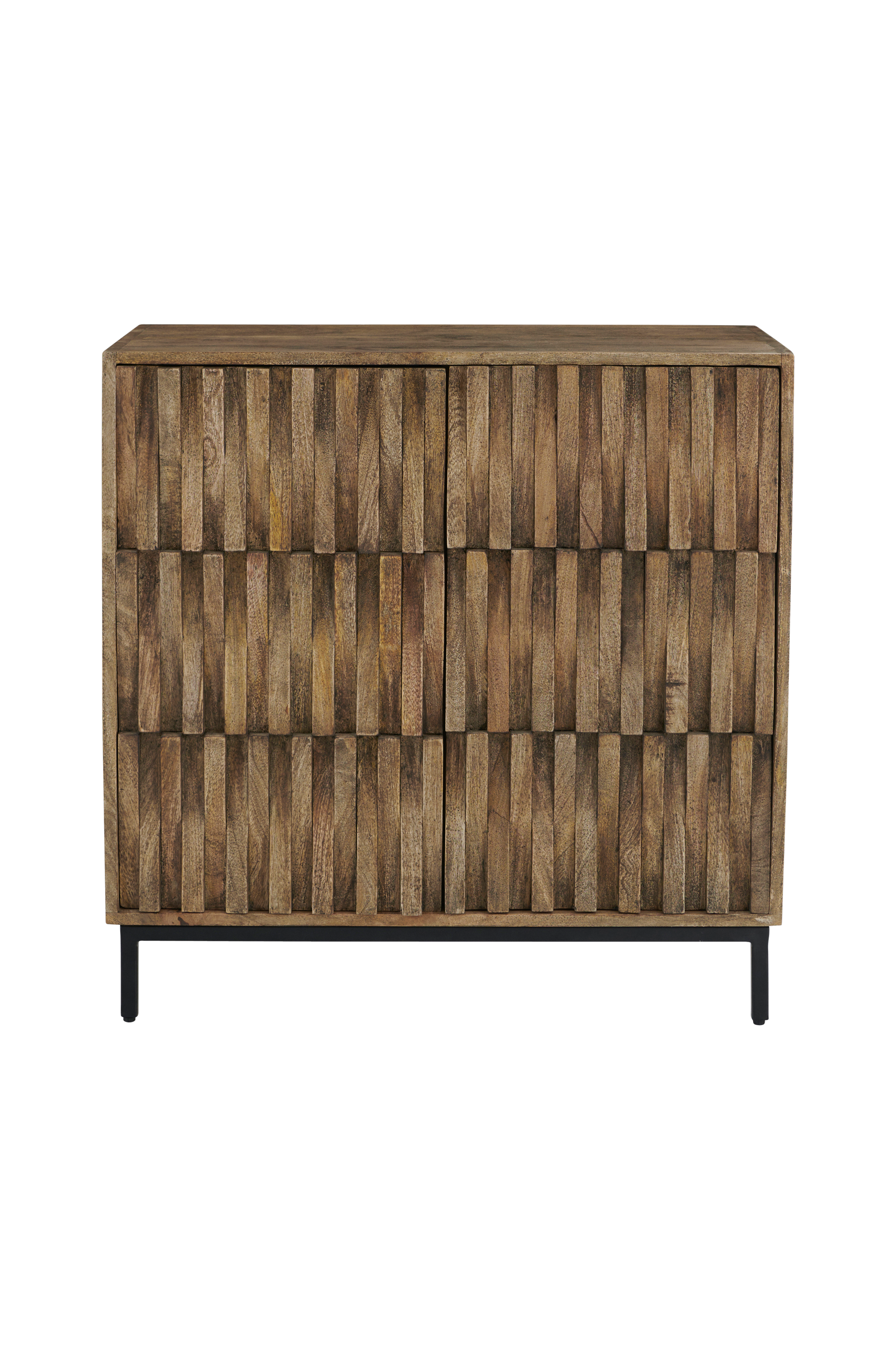 Skap i massivt mangotre med antikkfinish. To dører med et dekorativt, karvet teksturmønster. En fast hylle i skapet. Høyde mellom hylle 31,5 cm. Avtagbare ben i svart metall. Frihøyde under møbelet 9 cm.