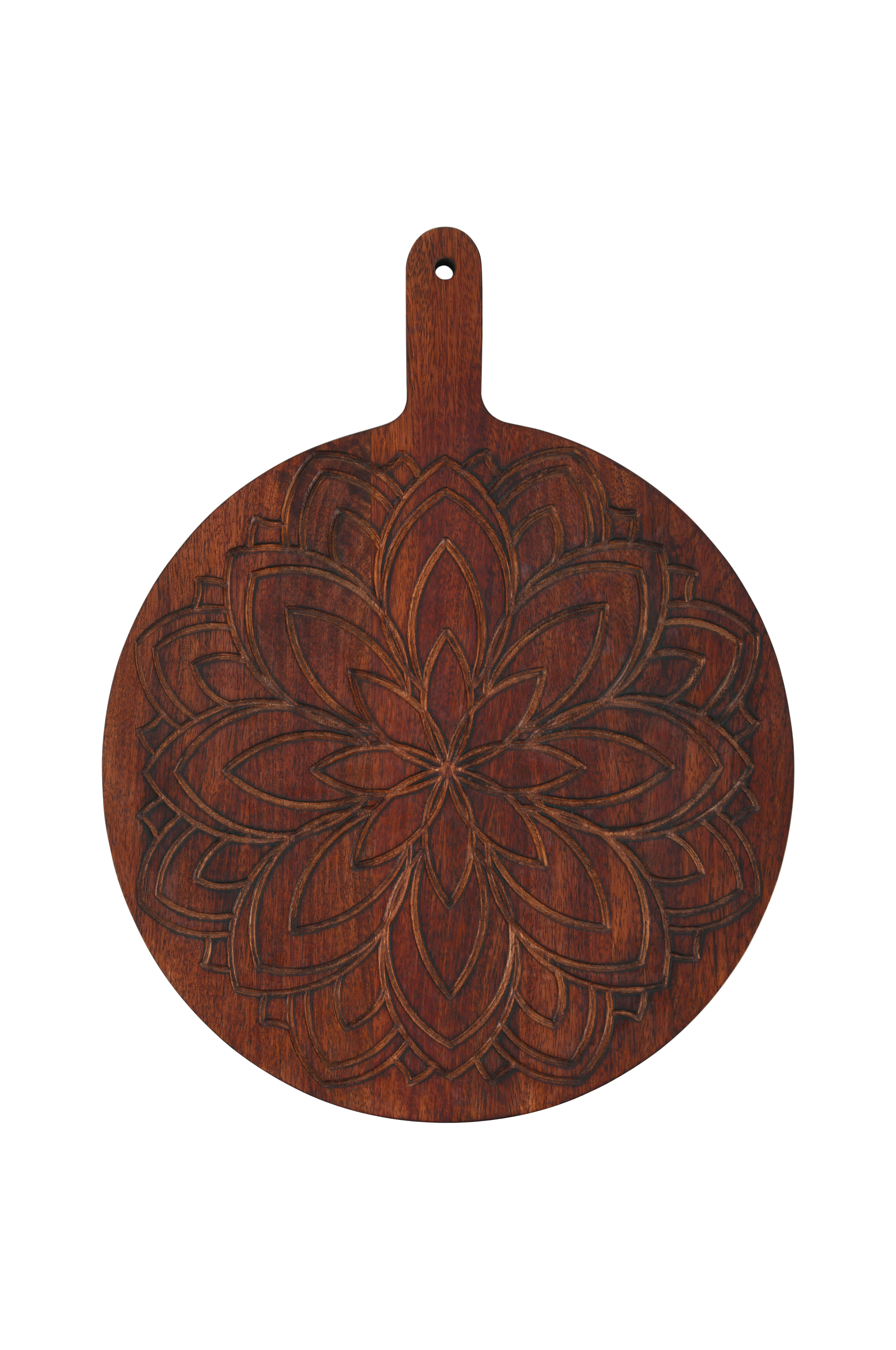Skjærefjøl av mangotre med vokset finish. Utskåret mønster på forsiden. Håndtak med hull for oppheng. Håndtakets lengde 10 cm.