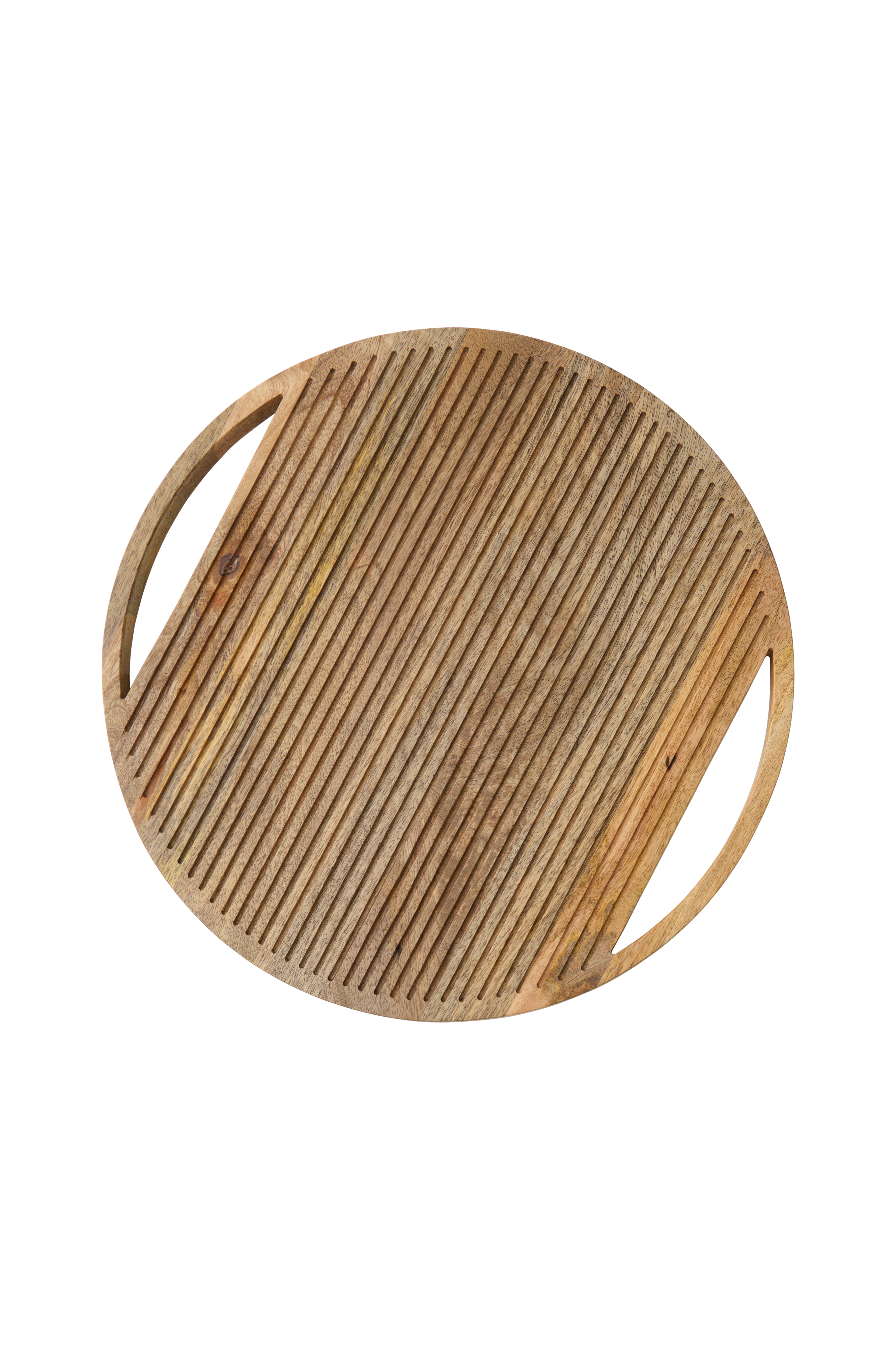 Dekorativt serveringsbrett i mangotre med behandling som gjør det trygt å bruke sammen med mat. Rillet mønster på forsiden og glatt bakside.