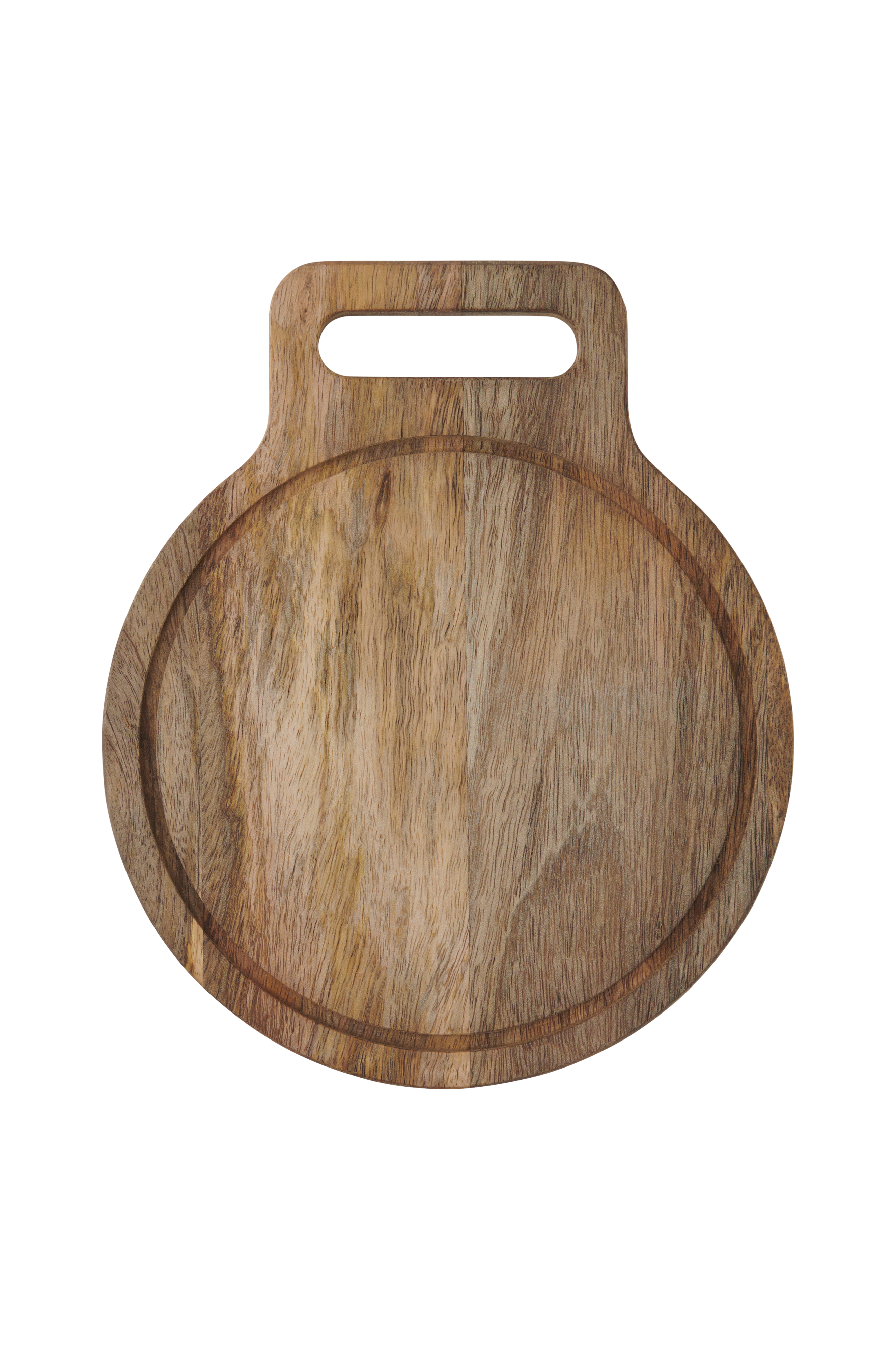 Rund skjærefjøl av mangotre med håndtak.