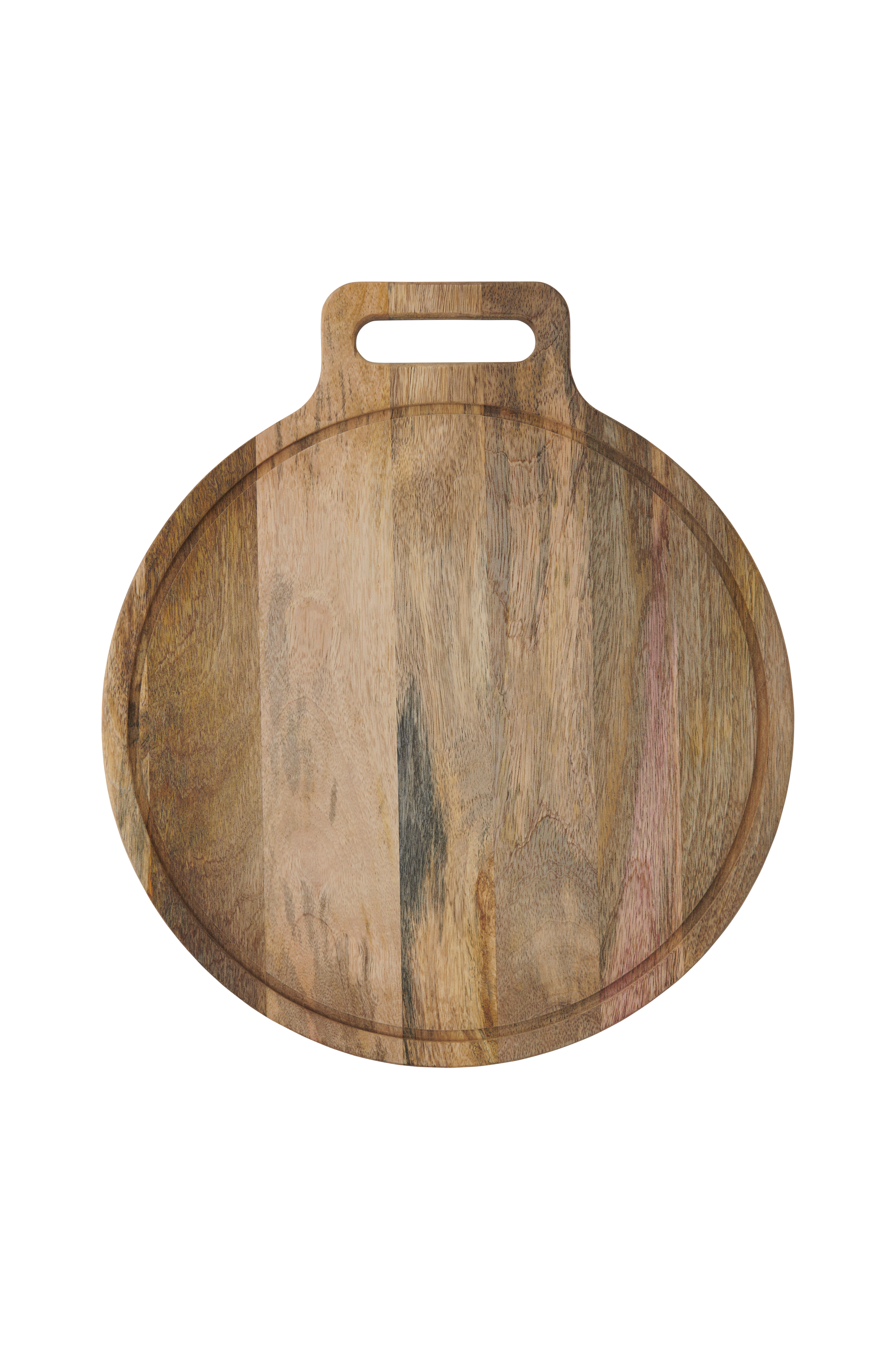 Rund skjærefjøl av mangotre med håndtak.