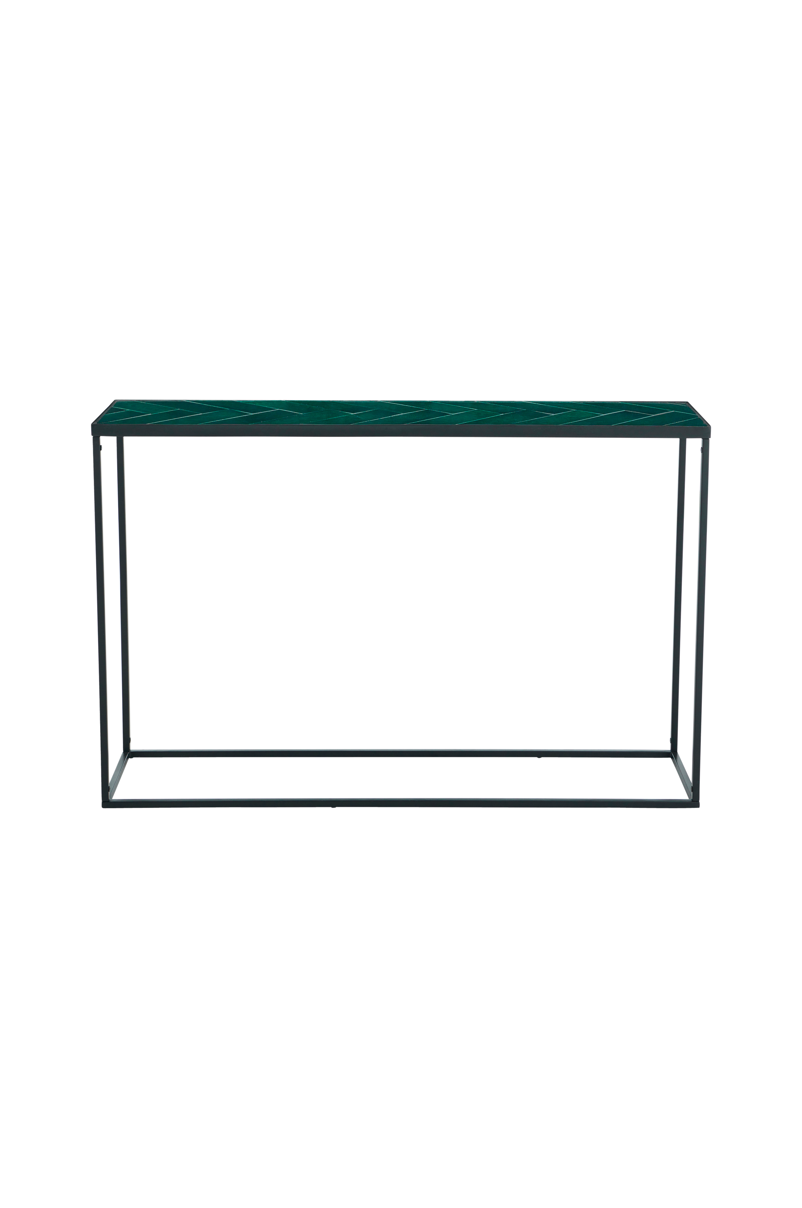 Sidebord med stamme/ben av pulverlakkert metall. Topplate med ruter i glasert keramikk.