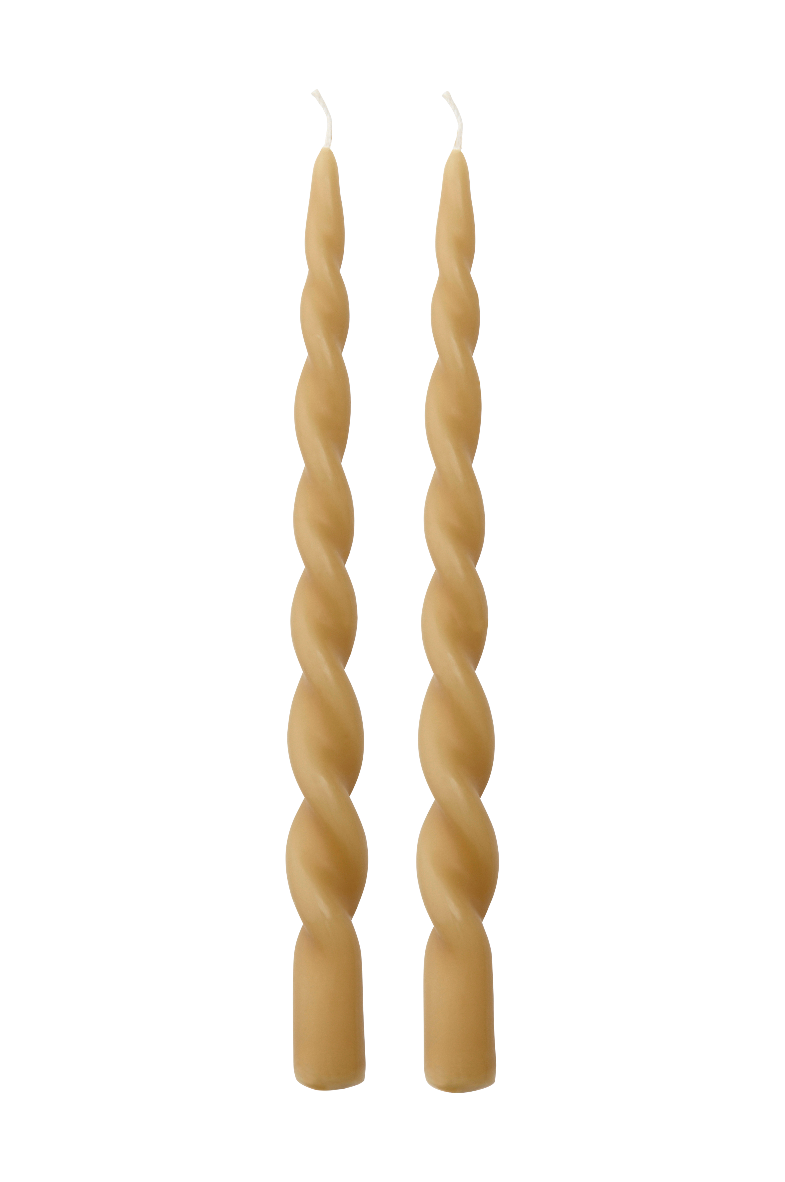 Vridde, flate lys i 2-pk. Høyde 29 cm, diameter 2,2 cm. Brennetid ca. 9 timer. Lysene er fremstilt av 100% parafin. Parafin er brukt istedenfor stearin fordi dette materialet er mykere. Det gjør at lyset kan vris i fasong. Det er ikke mulig med stearin som er for hardt til å kunne vris.