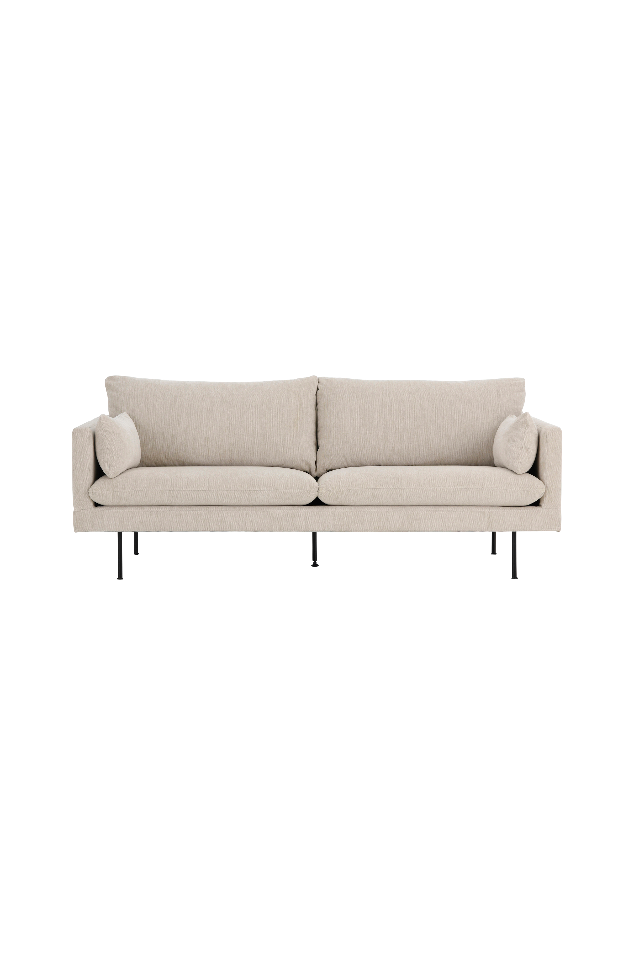 3-seter sofa med ben av metall. Ramme av furu med vevbånd og nozagfjæring. Trekk i 100% polyester. Martindale > 25 000. Fyll av polyeterskum. Trekket er avtagbart på rygg- og sitteputer. Inkludert 2 armleneputer. Frihøyde under møbelet 20 cm. Enklere montering.