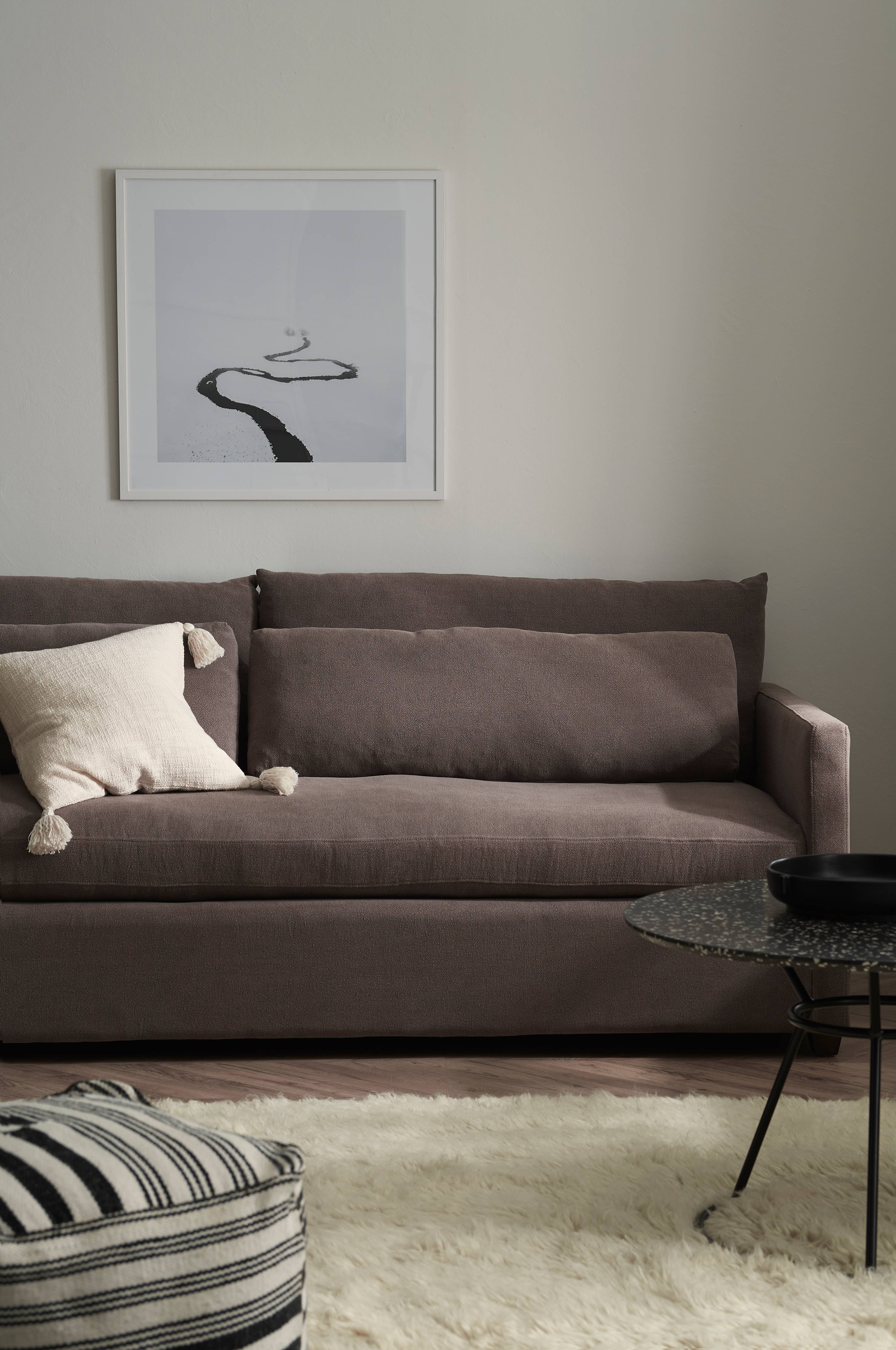 Sofa i skandinavisk stil med trekk i lin. Faste sitteputer og to løse ryggputer. Trekket er ikke avtagbart. Totale mål: Høyde 88 cm, bredde 244 cm, dybde 98 cm. Sittehøyde ca. 46 cm, sittedybde 56 cm, sittebredde 222 cm. Høyde på bena 7 cm. Høyde fra gulv til armlene 68 cm. Leveres montert, kun bena skrus på ved levering.