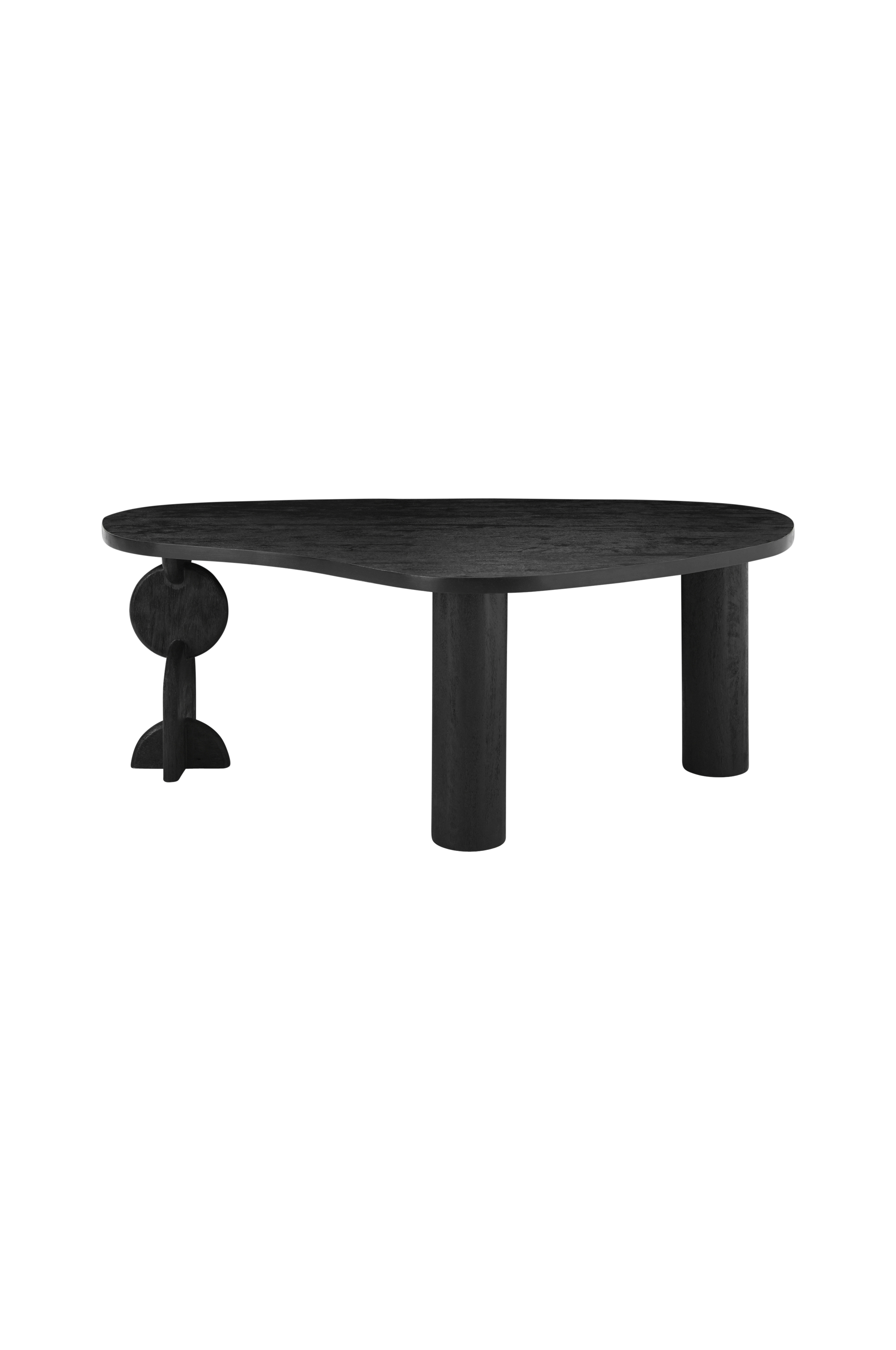 Sofabord i mangotre med uregelmessig, organisk form. Bordplaten har en vokset overflate med tydelig tretekstur. To sylinderformede, kraftige ben samt et mindre ben med skulpterte designdetaljer. Produktet er sertifisert av Forest Stewardship Council (FSC), noe som betyr at det inneholder trevirke fra ansvarlig skogbruk som tar hensyn til mennesker og miljø.