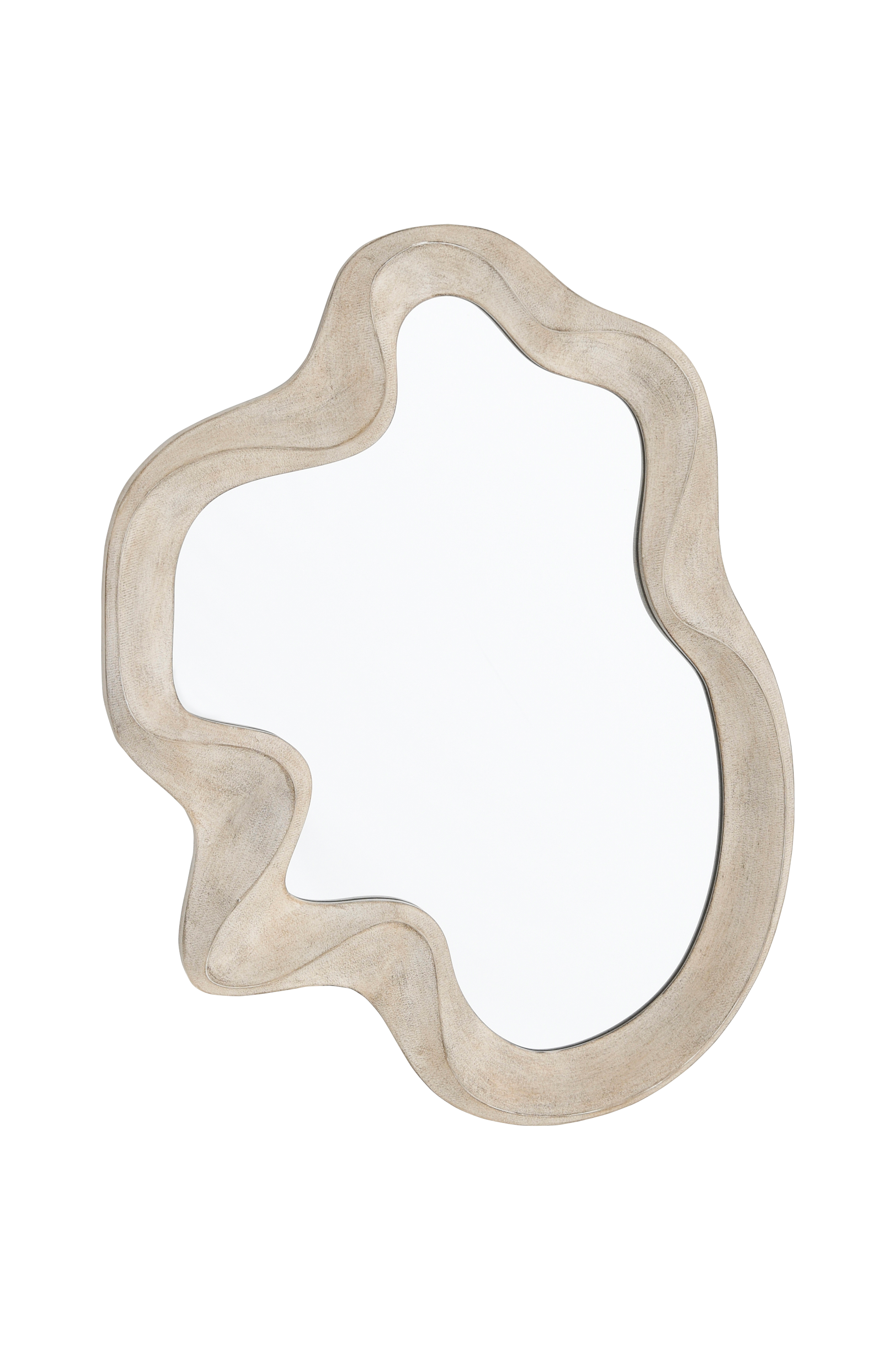Speil med uregelmessig, organisk form. Ramme av tre. Veggfester på baksiden.
