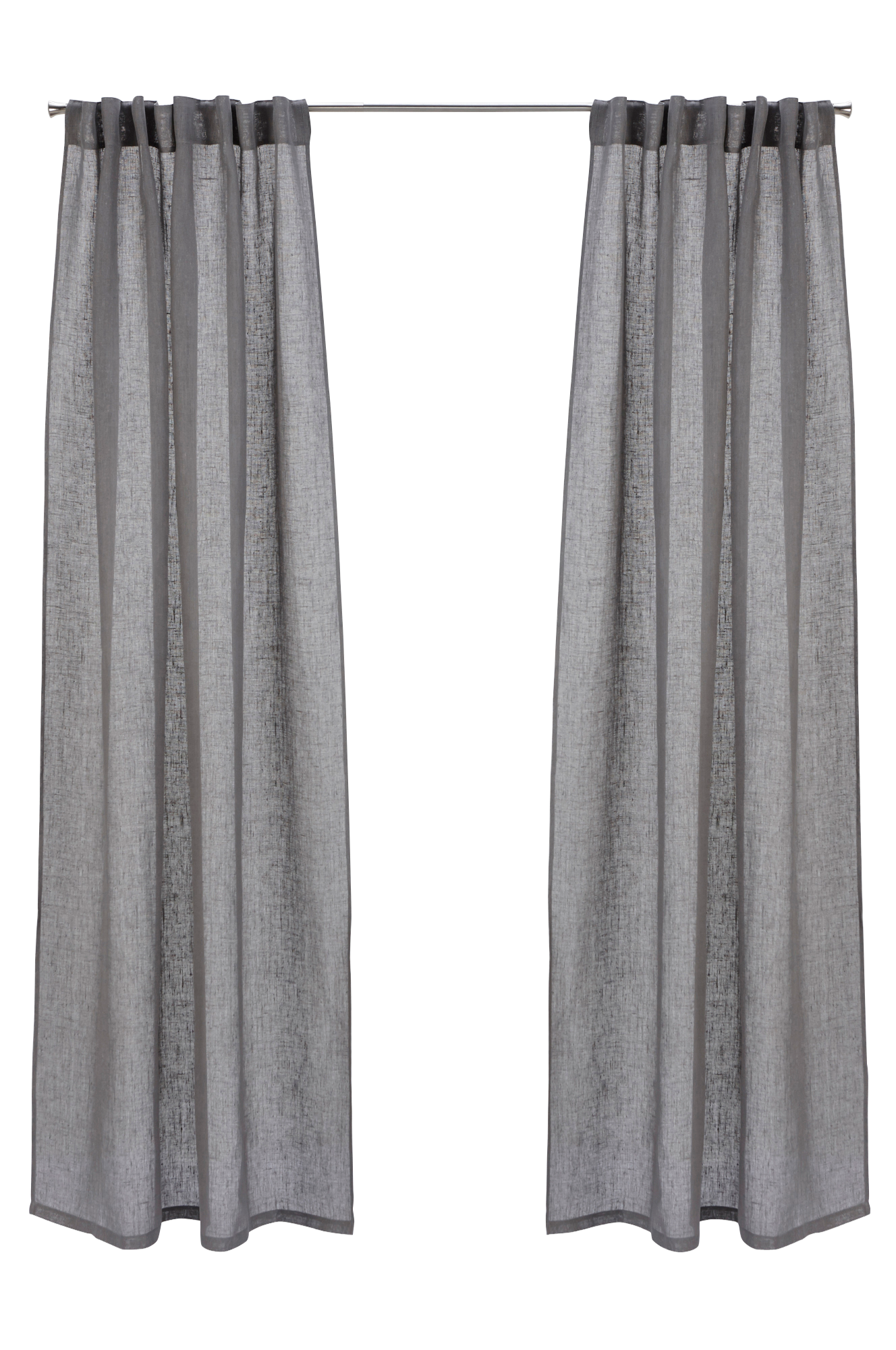Ekte lin i tynn voile. Vask 40°. Kan krympe ca 7%. Ensfarget ekte lin i løst vevd voile. Vask 40°. Kan krympe ca 7%. Stropper på baksiden gir pent oppheng. Faldet rundt. Finnes i 2 lengder, 220 cm og 250 cm. Bredde 145 cm. Vaskes separat. Velg mellom å stryke slett, eller tørketromle på lav temperatur for en myk følelse og vasket look.