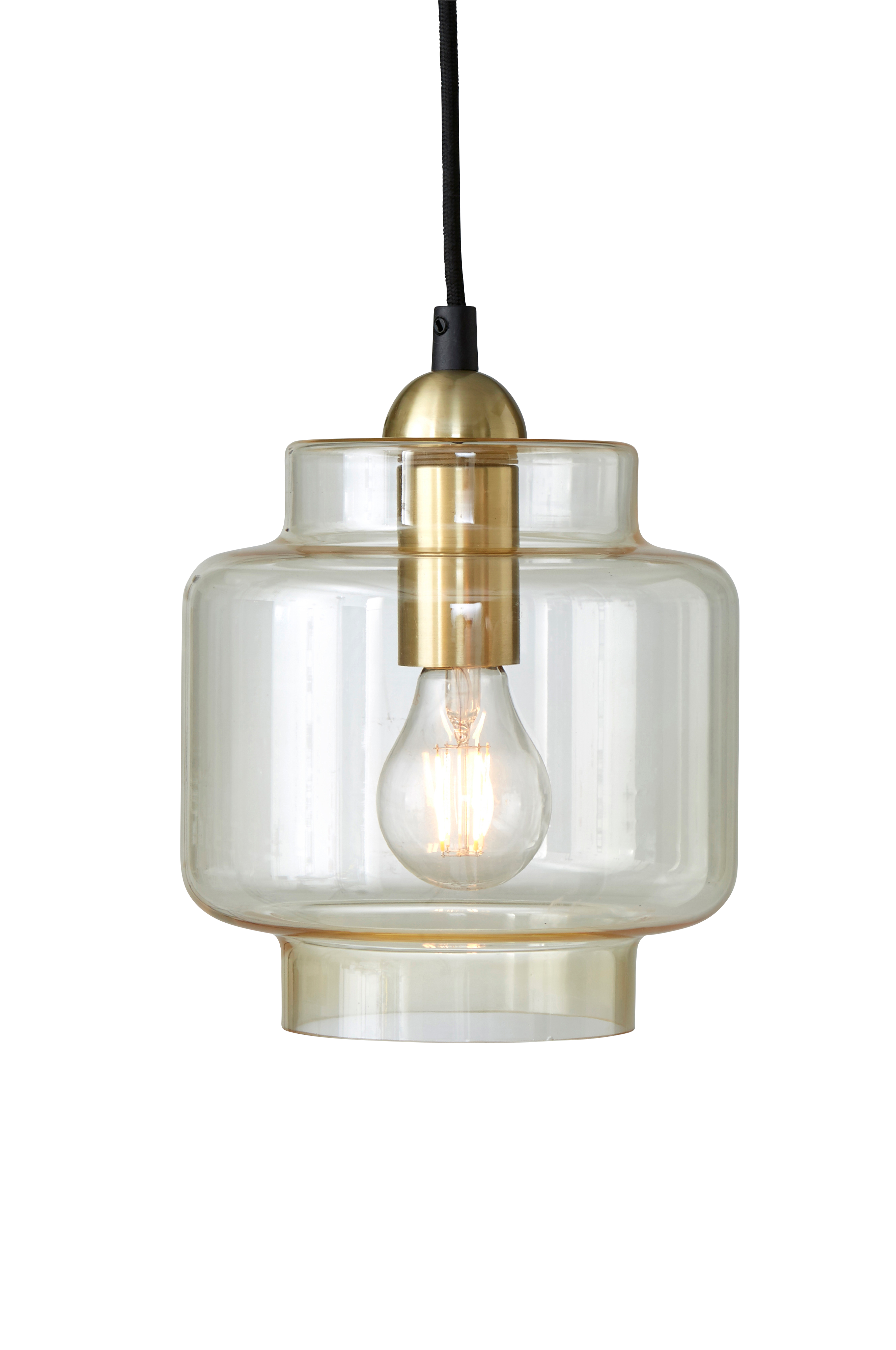Taklampe av lyst ravfarget glass med sokkel i messingfarget metall. Høyde ca. 20 cm, diameter ca. 18 cm. Svart takkopp av plast med krokoppheng og kronkontakt. Svart tekstilkledd ledning, ledningslengde 120 cm.