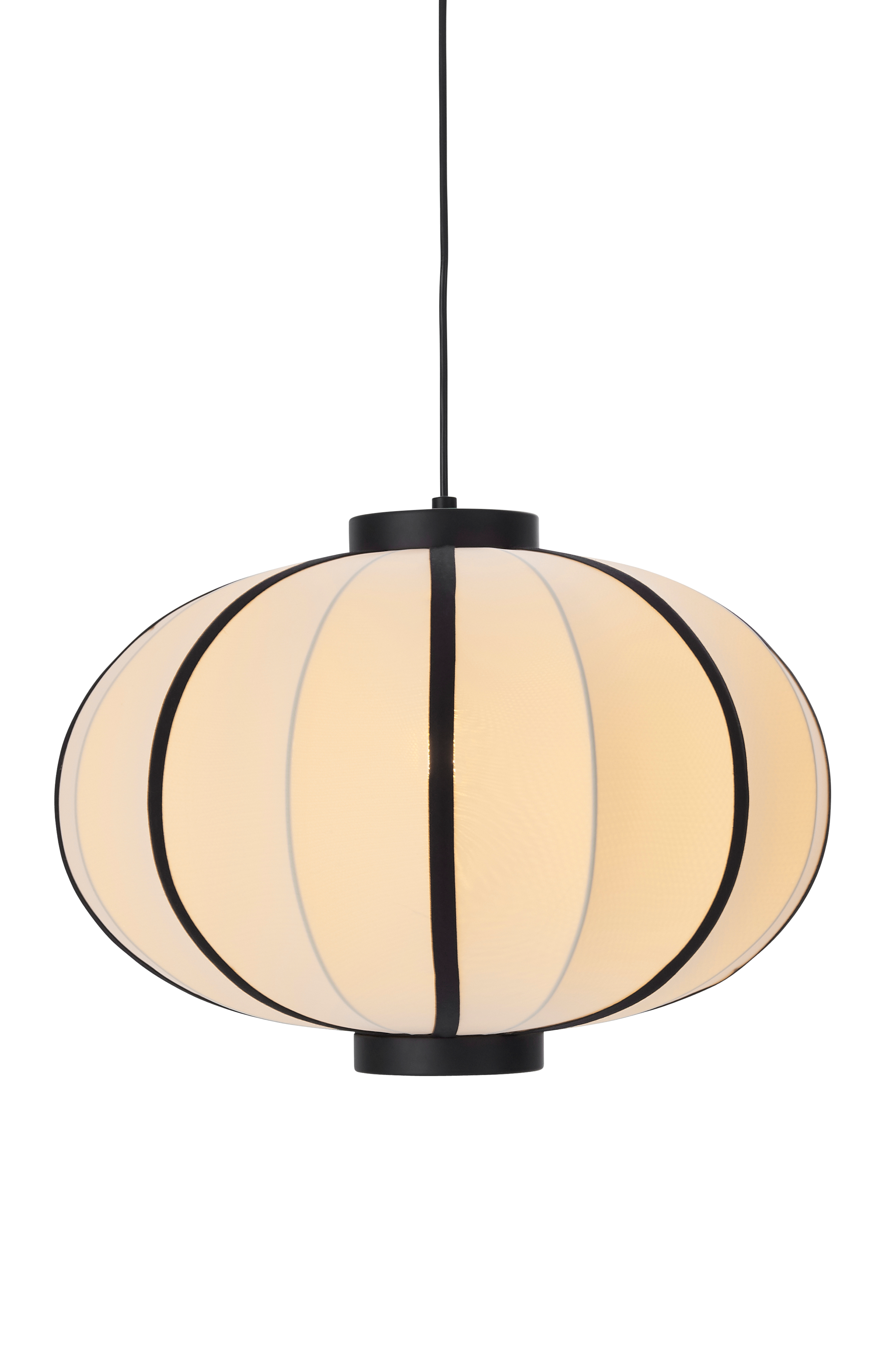Taklampe med skjerm av tekstil og svarte tekstilbånd på skjermen. Takkopp av plast. Skjermens mål: Høyde 35 cm, Ø 50 cm. Total høyde fra tak ca. 172 cm, kan avkortes til ønsket høyde. Svart ledning, ledningslengde 1,2 m. Monteres med krokoppheng. Sokkel E27. Maks 60W. Lyspære er ikke inkludert.