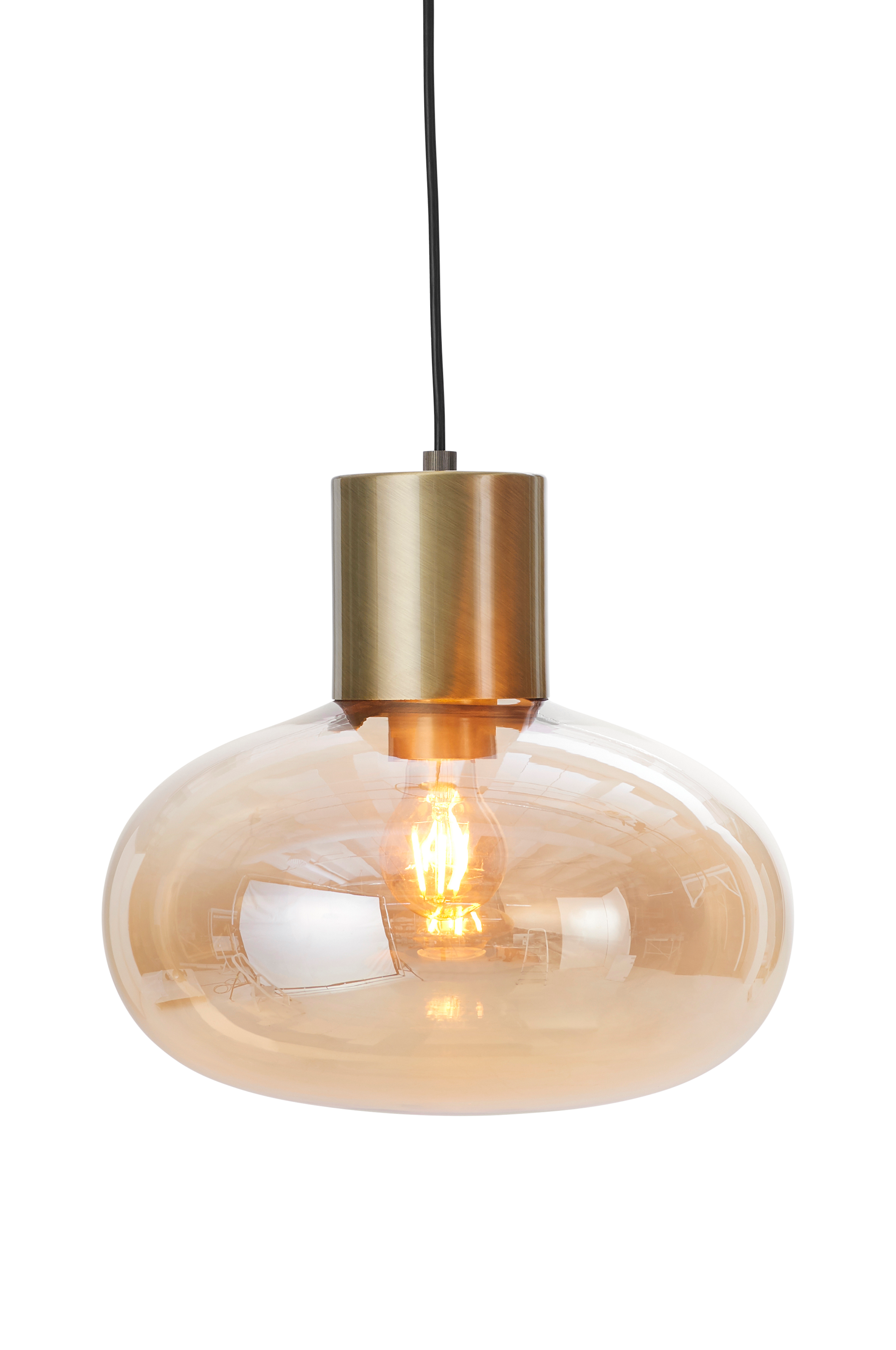 Taklampe med skjerm av glass. Sokkel og takkopp i metall. Glasskjermens størrelse: Ø 32 cm, høyde 22 cm (høyde inkl. sokkel 32 cm). Total høyde fra taket er ca. 150 cm, kan avkortes til ønsket høyde. Svart ledning, ledningslengde 1,2 m. Krokoppheng. Sokkel 1xE27, maks 40W. Lyspære er ikke inkludert.