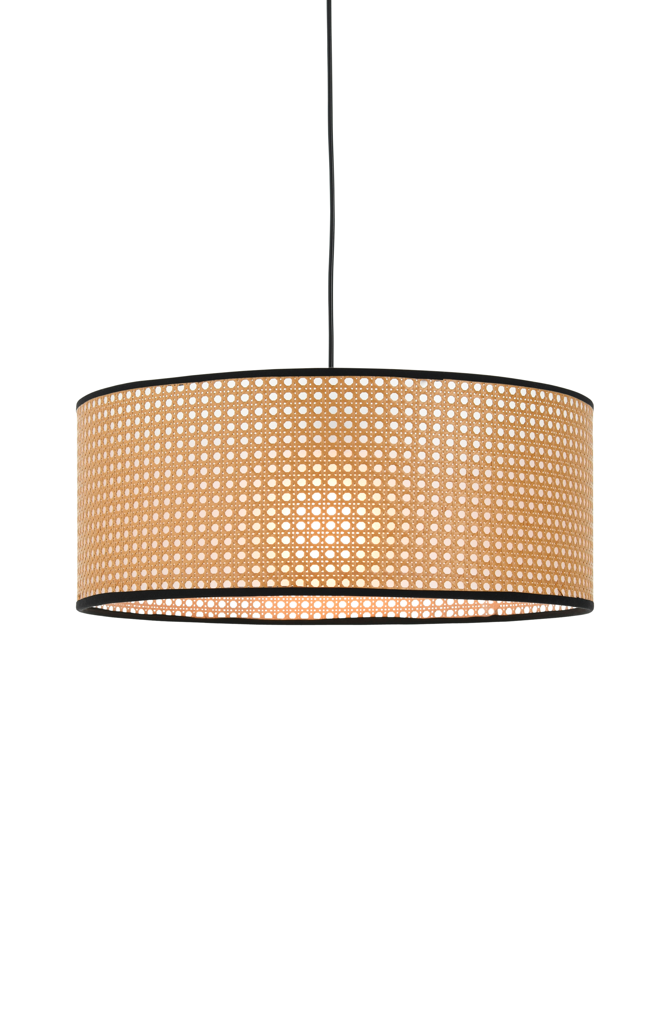Taklampe med skjerm av naturfarget kunstrotting og stamme av metall i mattsvart finish. Svart ledning og svart takkopp i plast. Total høyde fra tak ca. 140 cm. Monteres med krokoppheng. Lyspære er ikke inkludert. Ikke jordet.