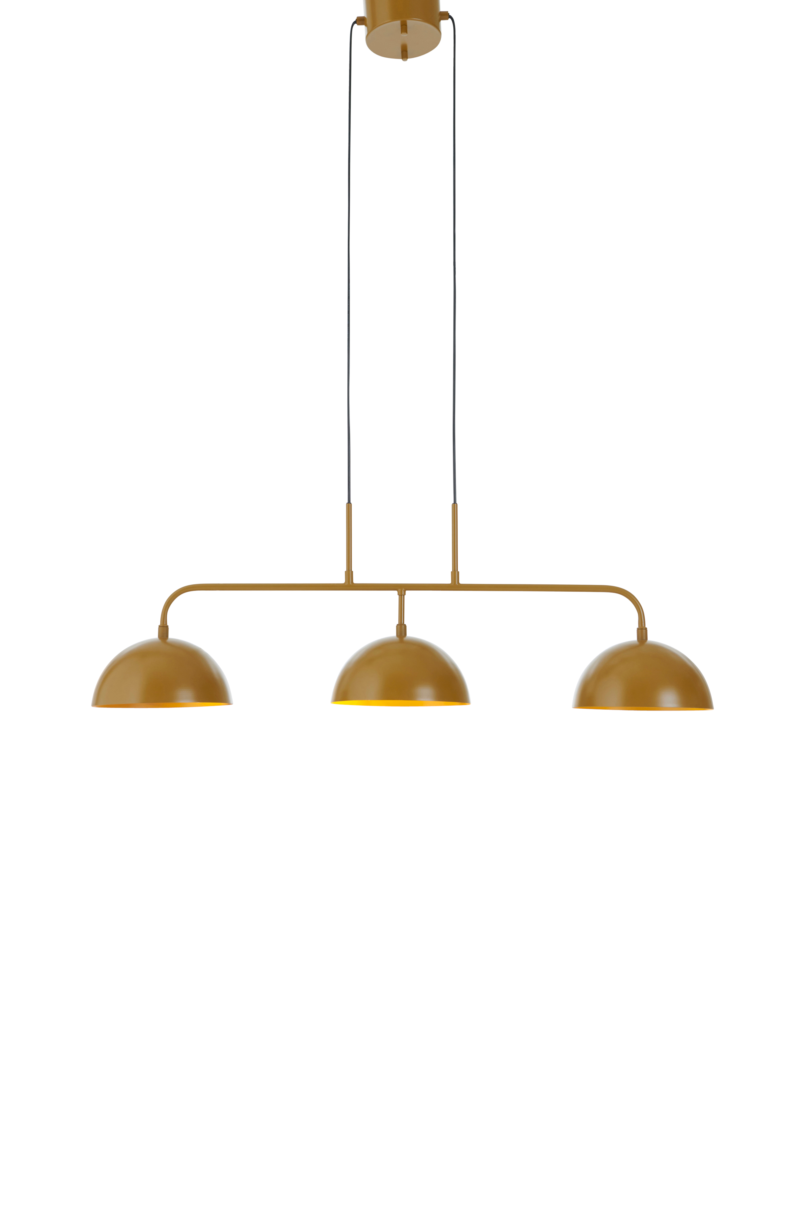 Taklampe av metall med tre skjermer. To lyskilder under hver skjerm.