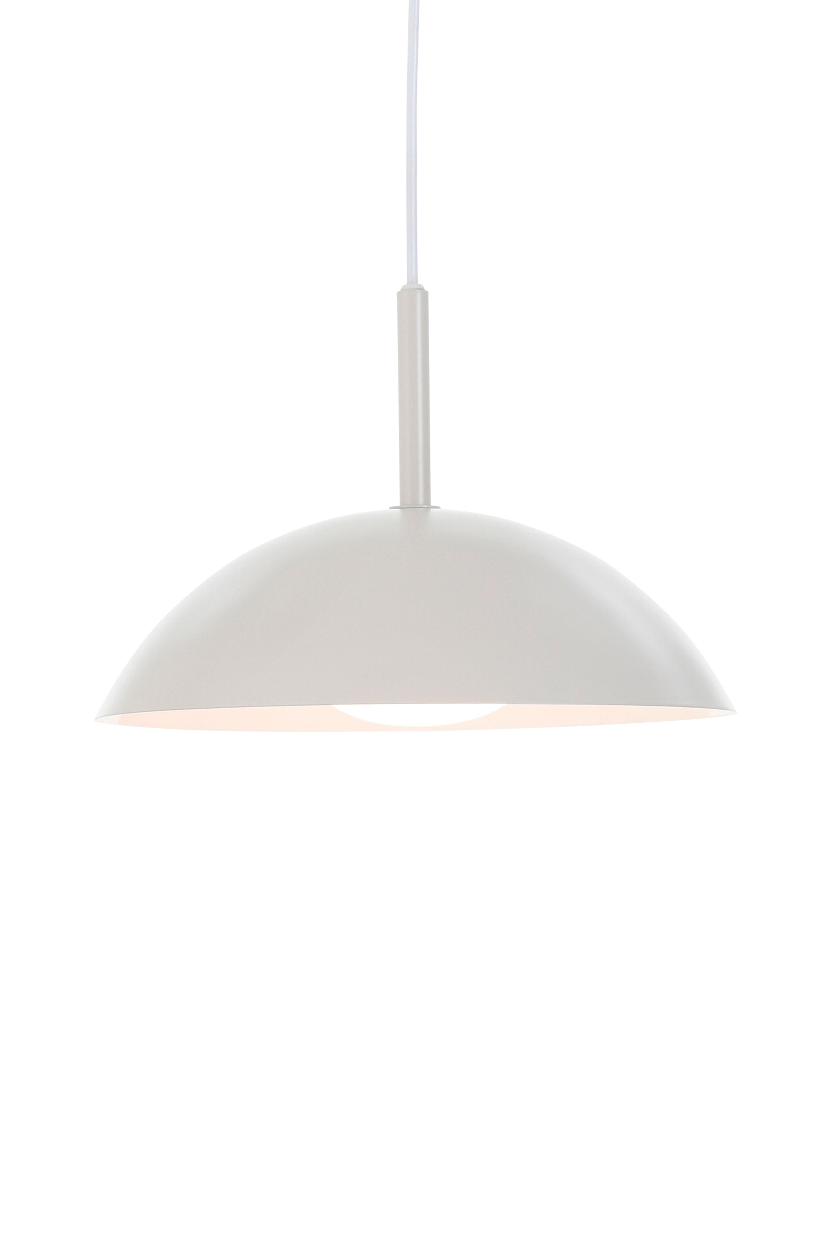 Taklampe med skjerm av metall og ellipseformet glasskuppel av opalhvitt glass.