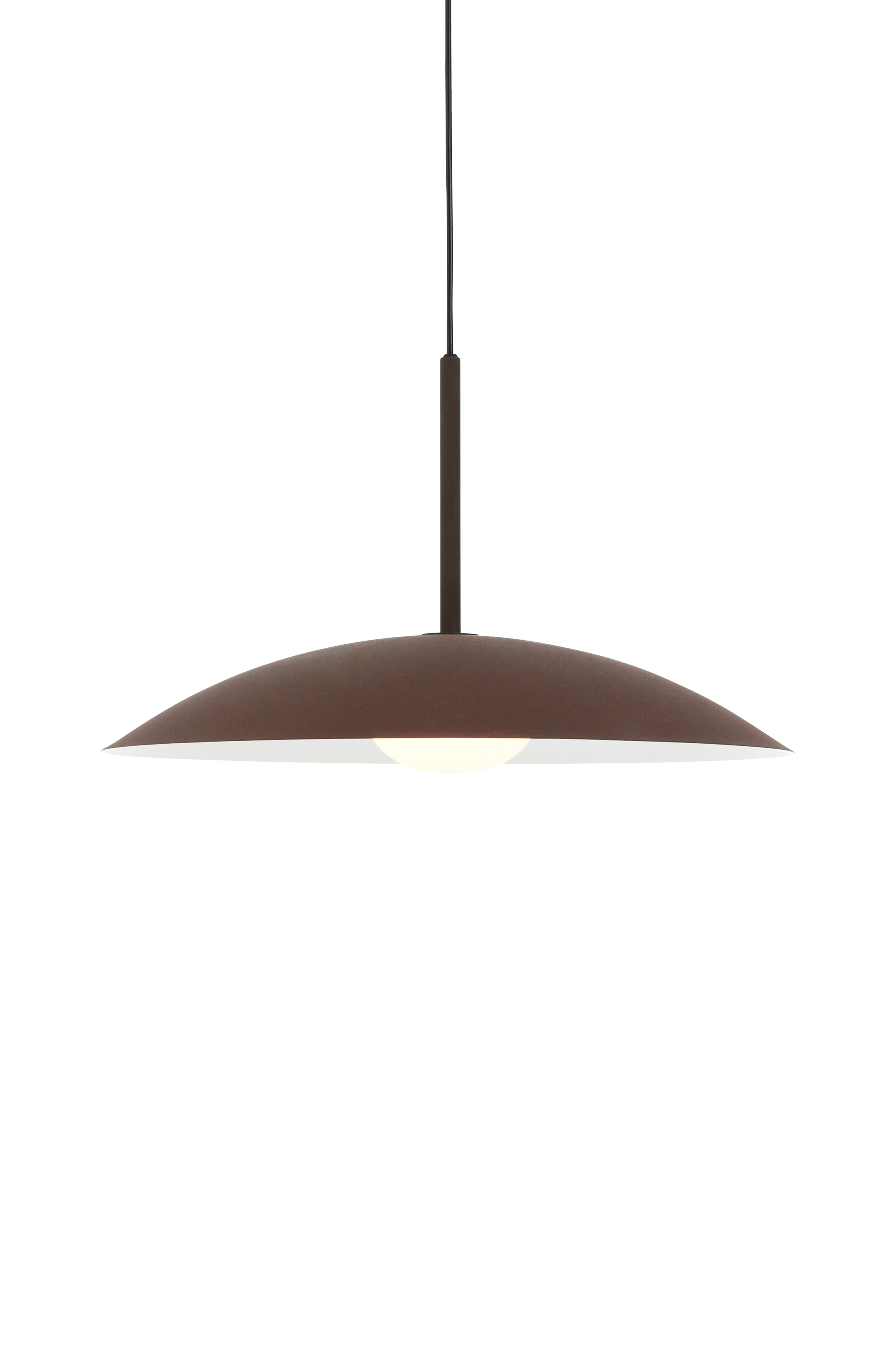 Taklampe med skjerm av metall i sandfinish og kuppel av opalhvitt glass. Takkopp i metall. Glasskuppelens mål: Diameter 12 cm x høyde 9,5 cm. Total høyde fra tak ca. 165 cm, kan kortes til ønsket høyde. Monteres med krokoppheng. Lyspære er ikke inkludert.