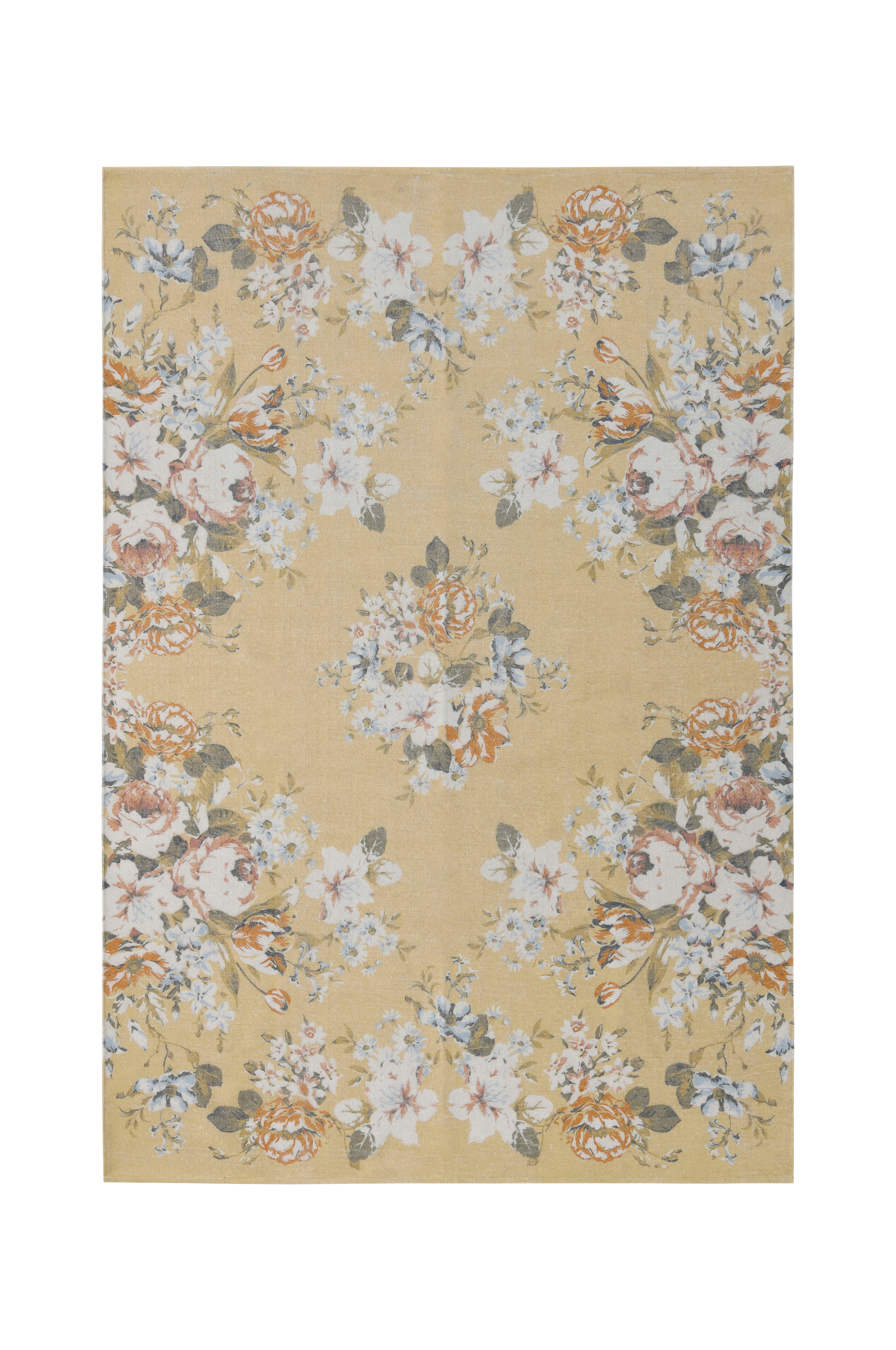 Vevd teppe av gjenvunnet polyester med trykt blomstermønster. Ingen frynser.