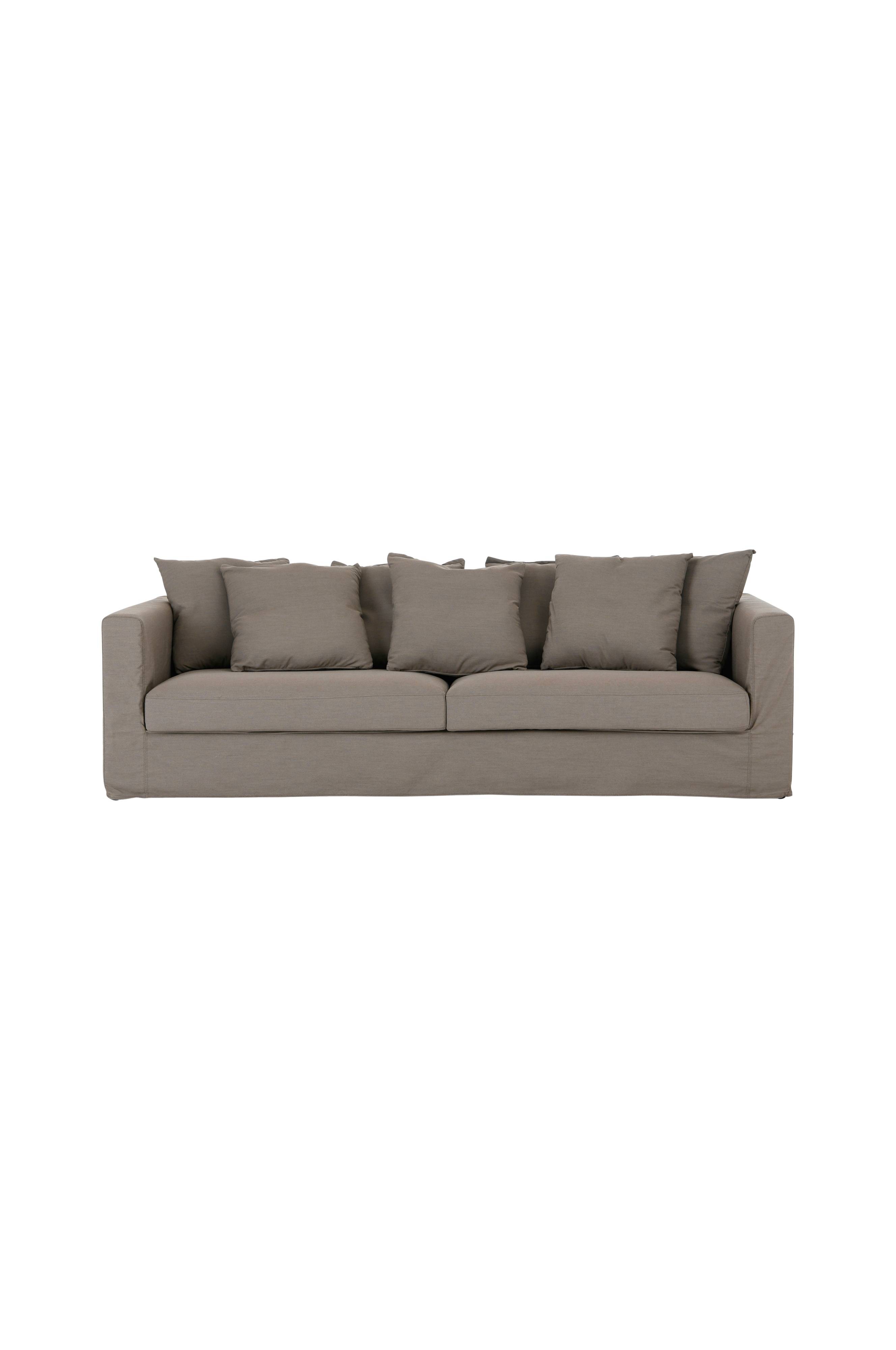 3-seters sofa i en svært lett konstruksjon. En sofa som tåler å stå ute i all slags vær, året rundt. Svært lett ramme og ben av rustfritt aluminium. Trekket er smuss- og vannavvisende i det unike, gjennomfargede stoffet Sunbrella. Stoffet er kledd på et mykt Quick Dry Foam-skum som er hurtigtørkende og slipper gjennom alt vannet, ingenting blir igjen i møbelet. Materialet gjør det mulig å bruke møbelet ca. 45 minutter etter kraftig regn. Det smussavvisende stoffet er lett å tørke av, og kan spyles med høytrykksspyler. Stoffet er også svært slitesterkt, og har høy lysekthet (tåler sol). 7 løse ryggputer og 2 sitteputer samt avtagbart stammetrekk.