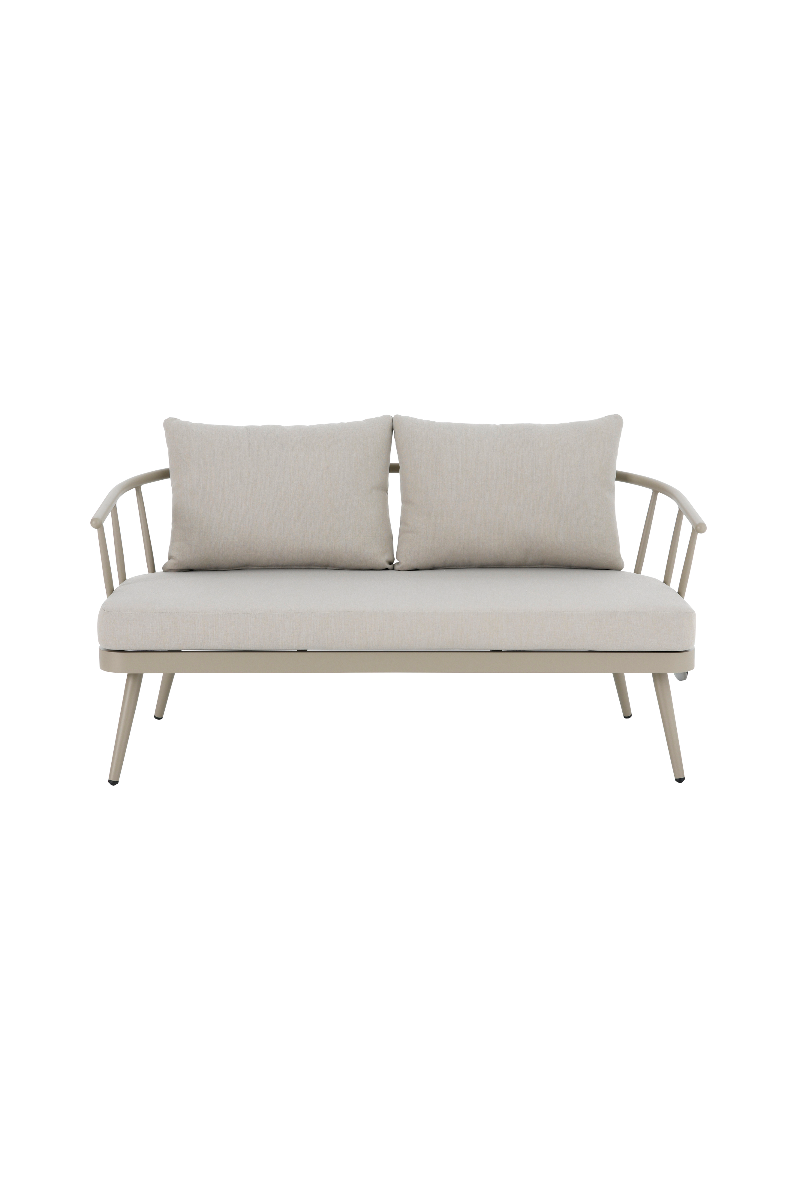 2-seters sofa med vannbestandig stamme i pulverlakkert aluminium. Hel sittepute og to ryggputer med trekk av polyester og skumfyll.