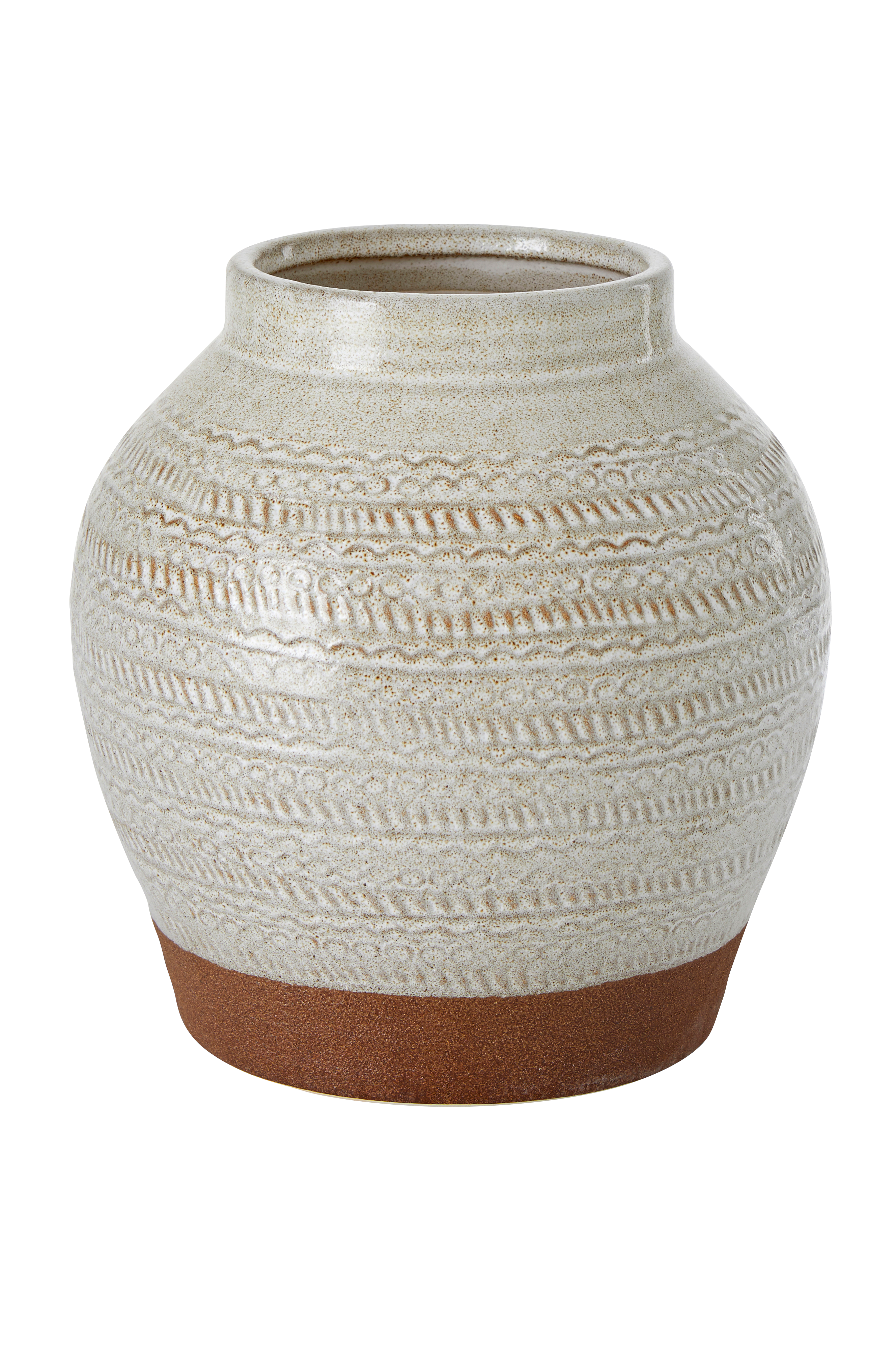 Hvit vase/krukke med brun bunn av steintøy med preget mønster. Høyde 26 cm, Ø 26 cm