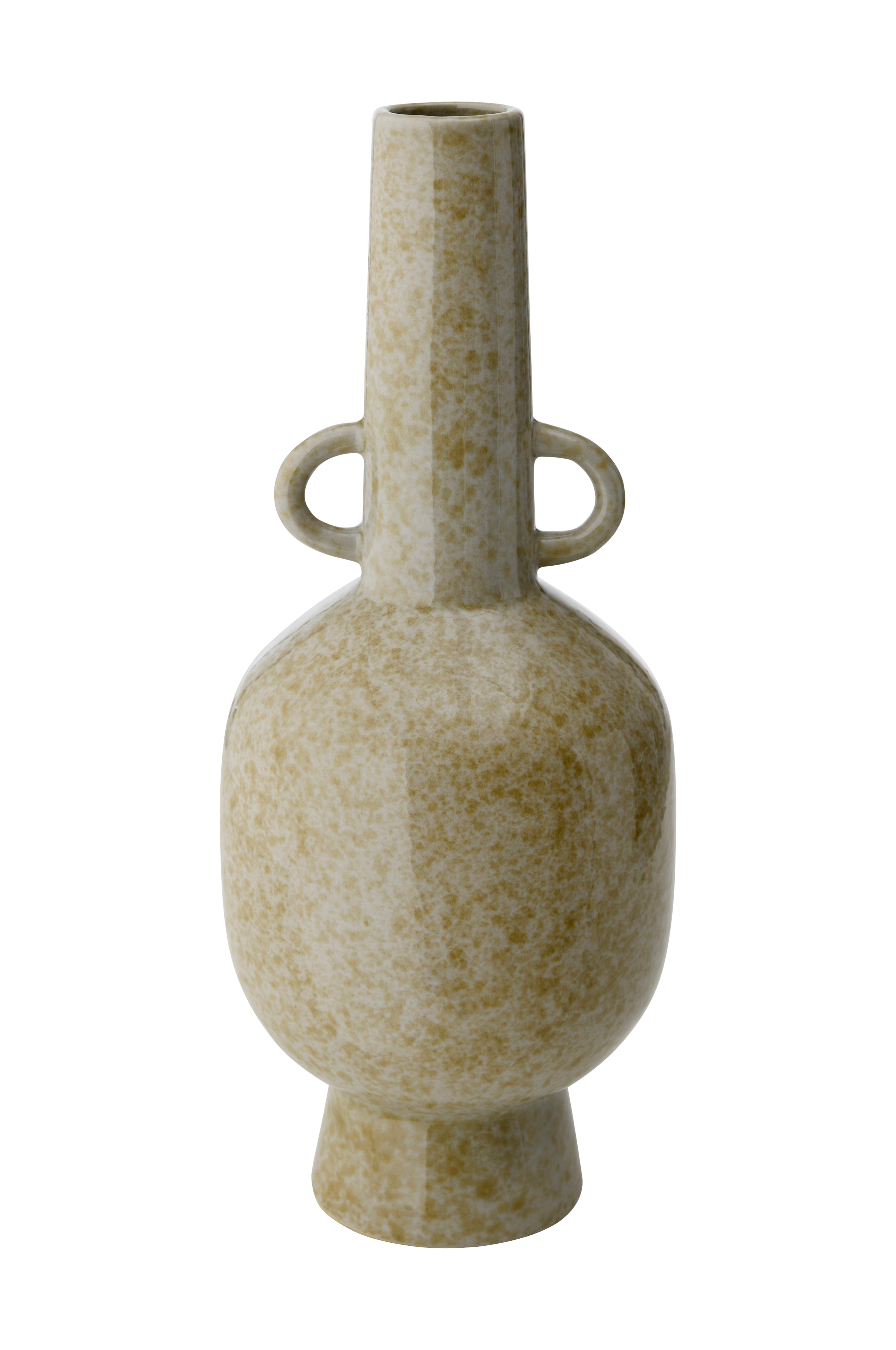 Vase i glasert steintøy med to små håndtak. Fargen går i naturlige skiftninger, noe som gjør at vasen føles ekte og unik. Diameter på det største 16,5 cm. Innvendig diameter ved åpningen 3,5 cm.