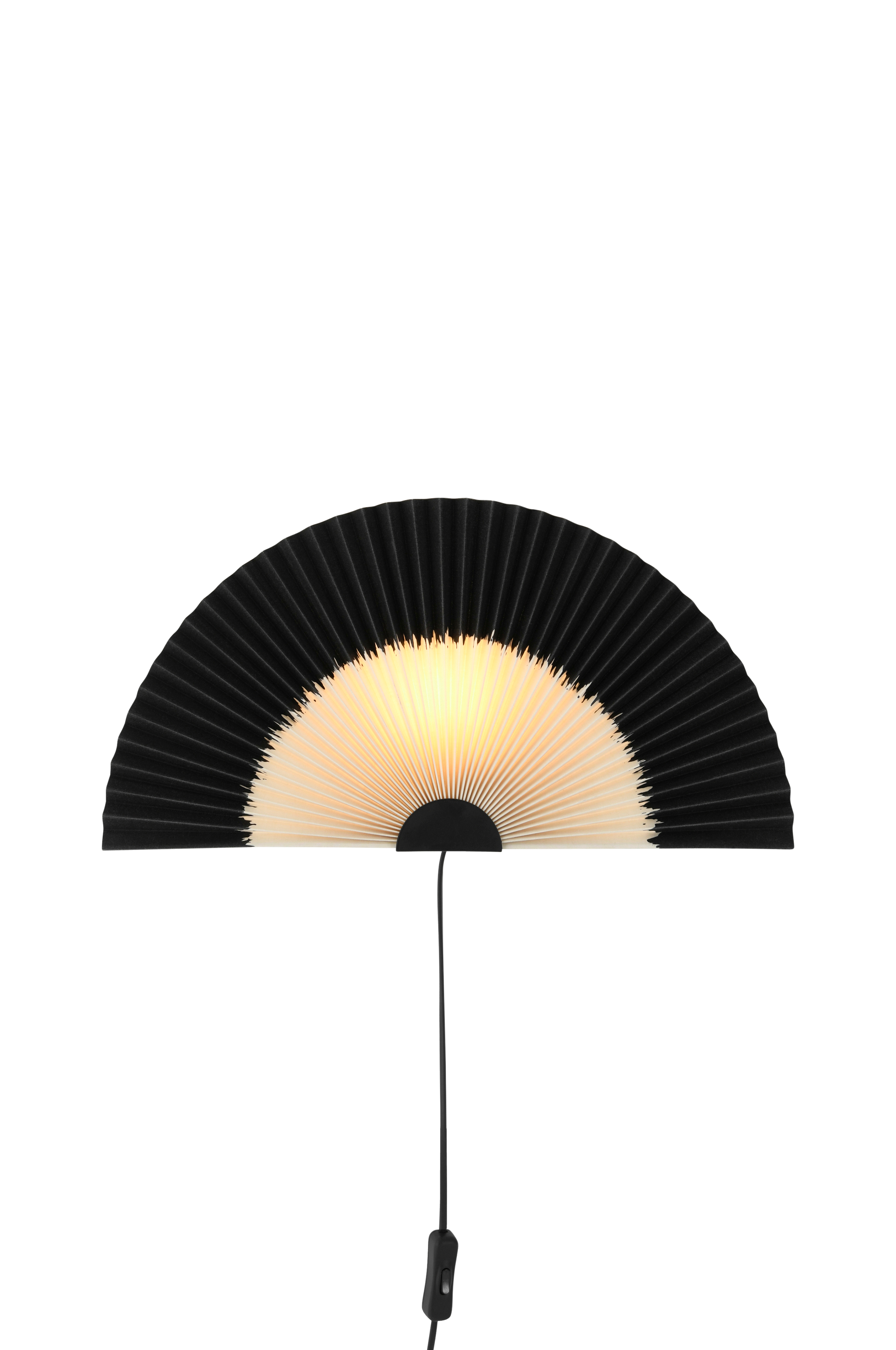 Vegglampe med skjerm i plissert tekstil og detalj av metall i mattsvart finish. Svart plastledning med strømbryter. Lyspære er ikke inkludert.