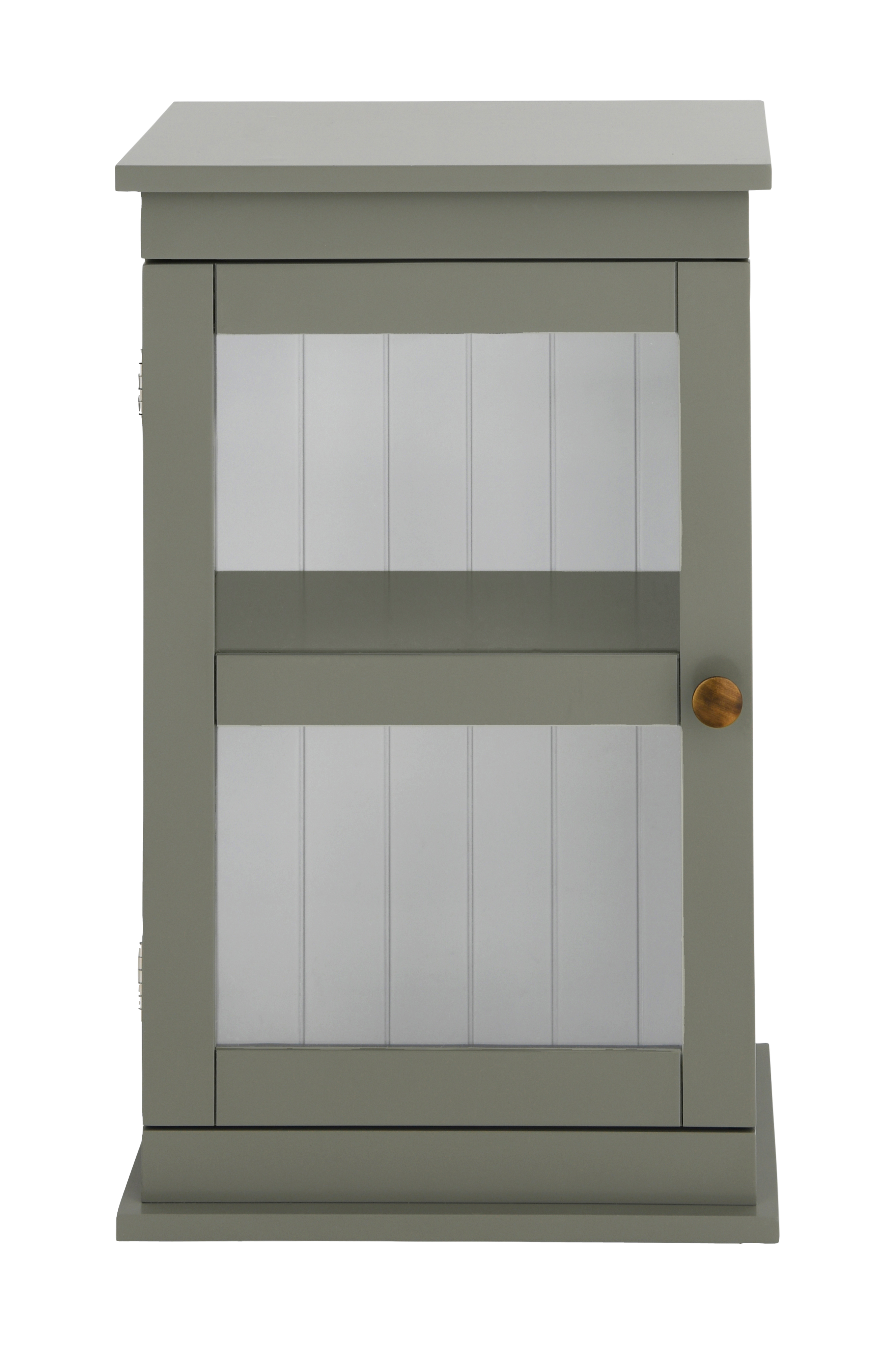 Veggskap i lakkert heltre og MDF med glassdør. Knott i metall med antikkmessingfarge. 1 fast hylle, høyde mellom hyller 27 cm. Montert.