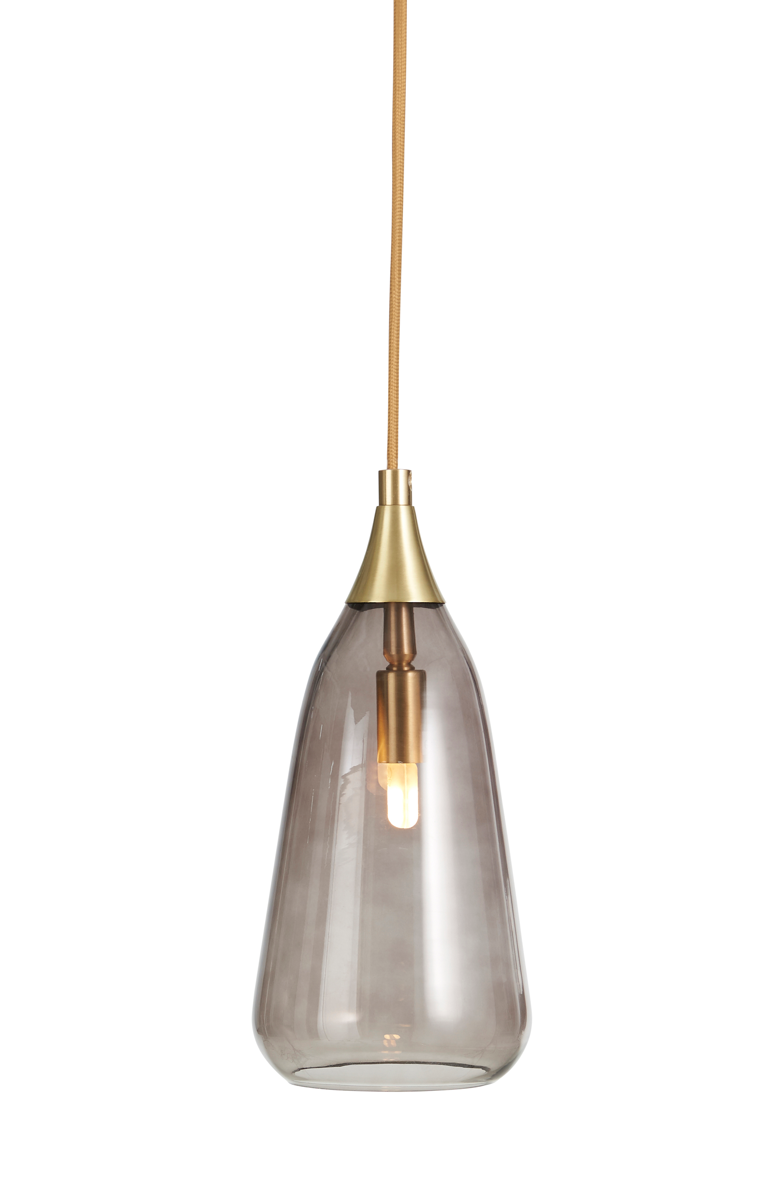 Vinduslampe i glass og metall med børstet messingfinish. Skjermens mål: Bredde 12 cm, høyde 27 cm. Gullbrun tekstilkledd ledning med strømbryter og støpsel. Avstand mellom strømbryter og støpsel ca. 100 cm. Justerbar lampesokkel som gjør at lampen henger rett. Hengeren kan flyttes til ønsket høyde. Sokkel G9. Maks. 3W.