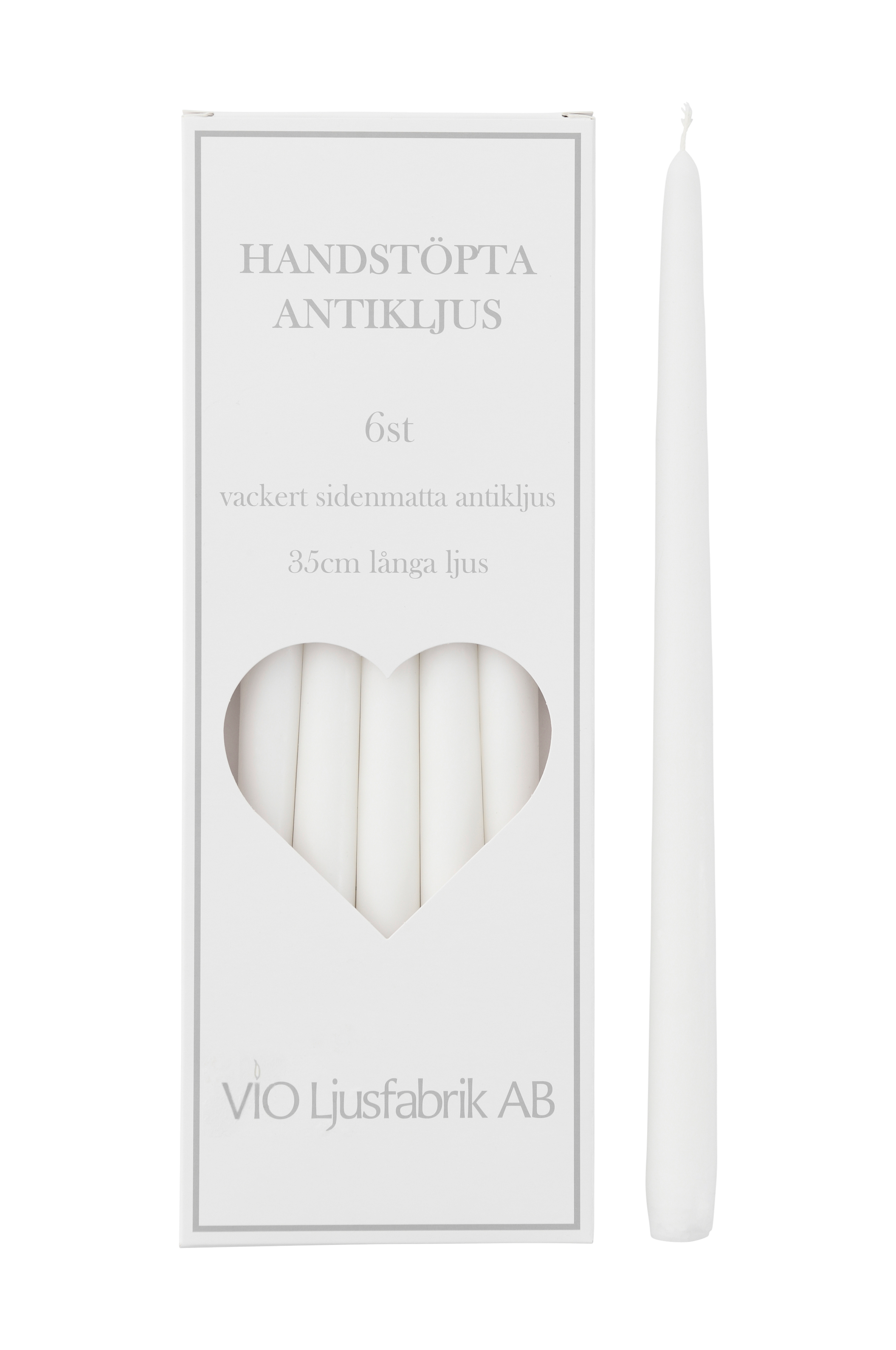 Antikklys i 6-pakning. Høyde 35 cm og diameter 2,2 cm. Brennetid ca. 10 timer. Lyset er produsert av 40% stearin og 60% parafin. Viktig! Forlat aldri brennende lys uten oppsikt.