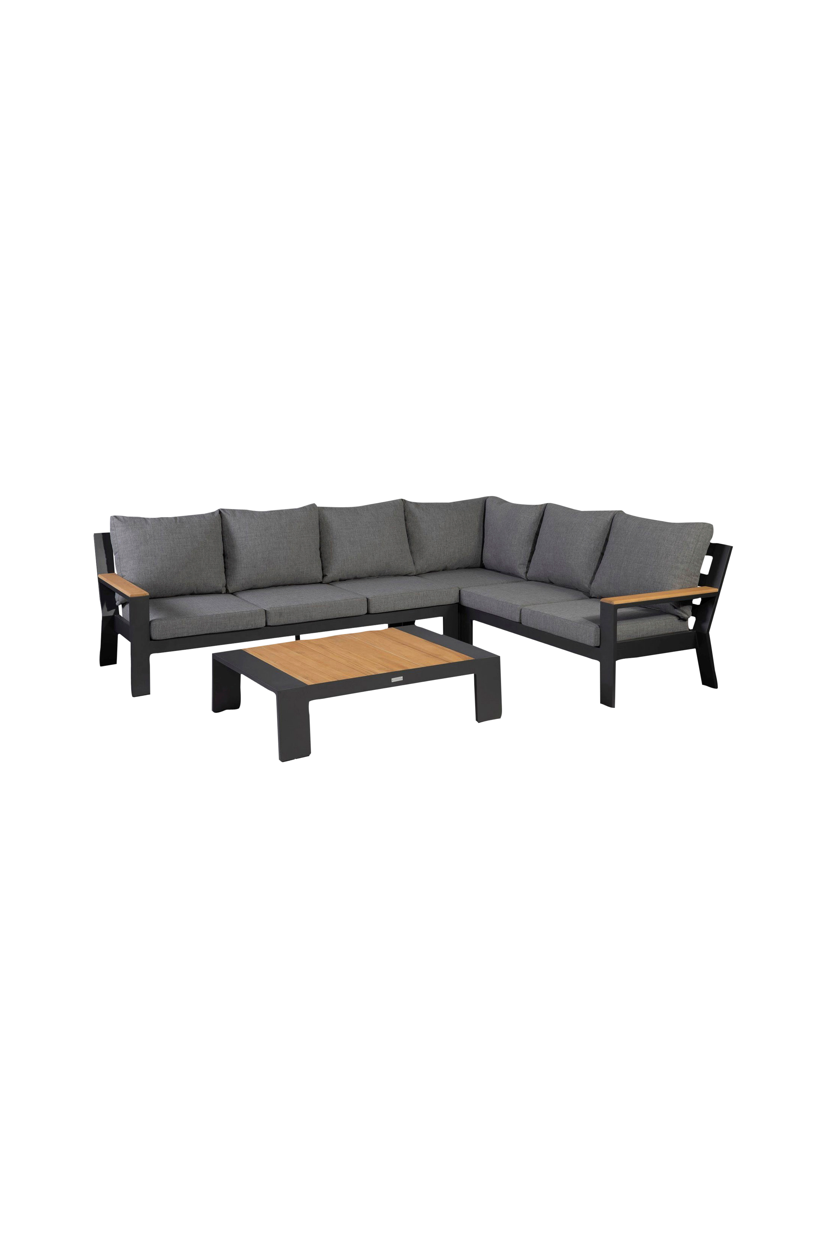 Hjørnesofaen Valerie har en stamme av aluminium som er vakkert dekorert med FSC®-sertifisert teak. Disse materialene er lettstelte.