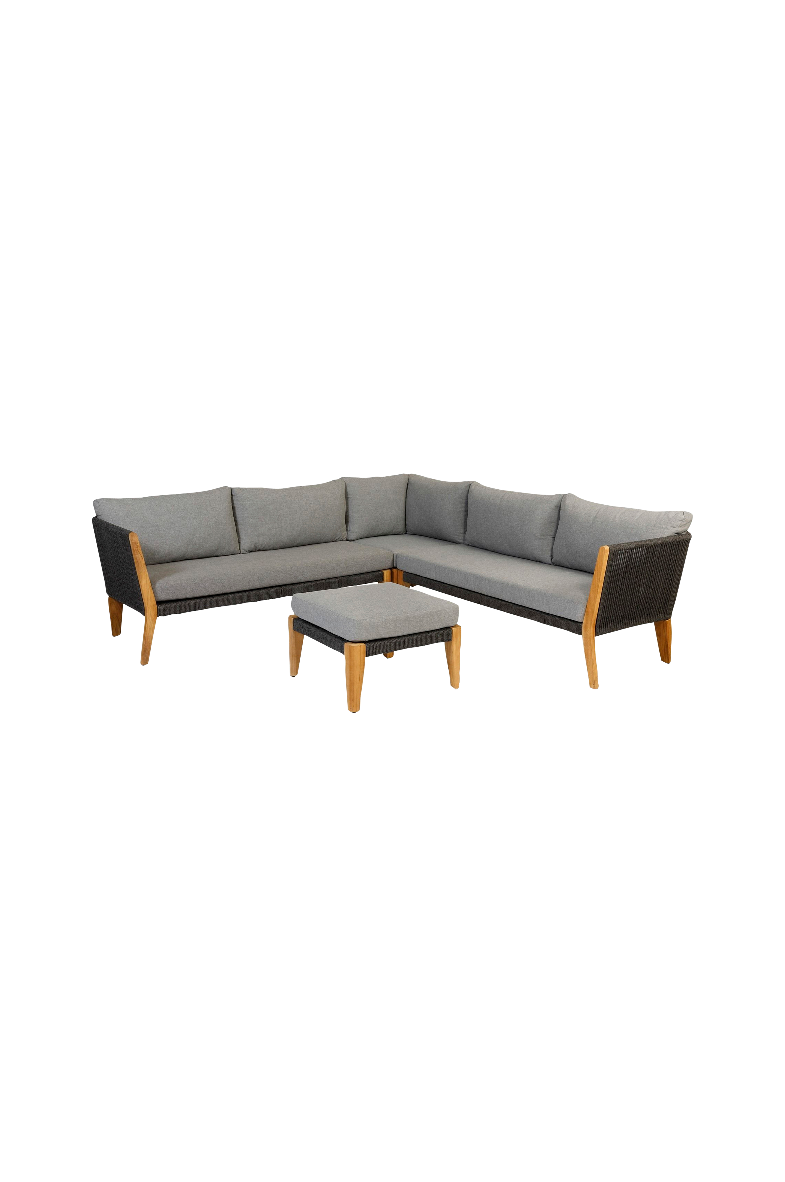San Remo hjørnesofa har en stamme av aluminium og vakre detaljer med tau og FSC®-sertifisert teak. Tau har vært en sterk trend de siste årene, og er et svært solid og UV-bestandig materiale. Sittegruppen har behagelige puter. Putene har robust trekk av olefin og er fylt med standardskum. Vi anbefaler at putene oppbevares innendørs når de ikke er i bruk.