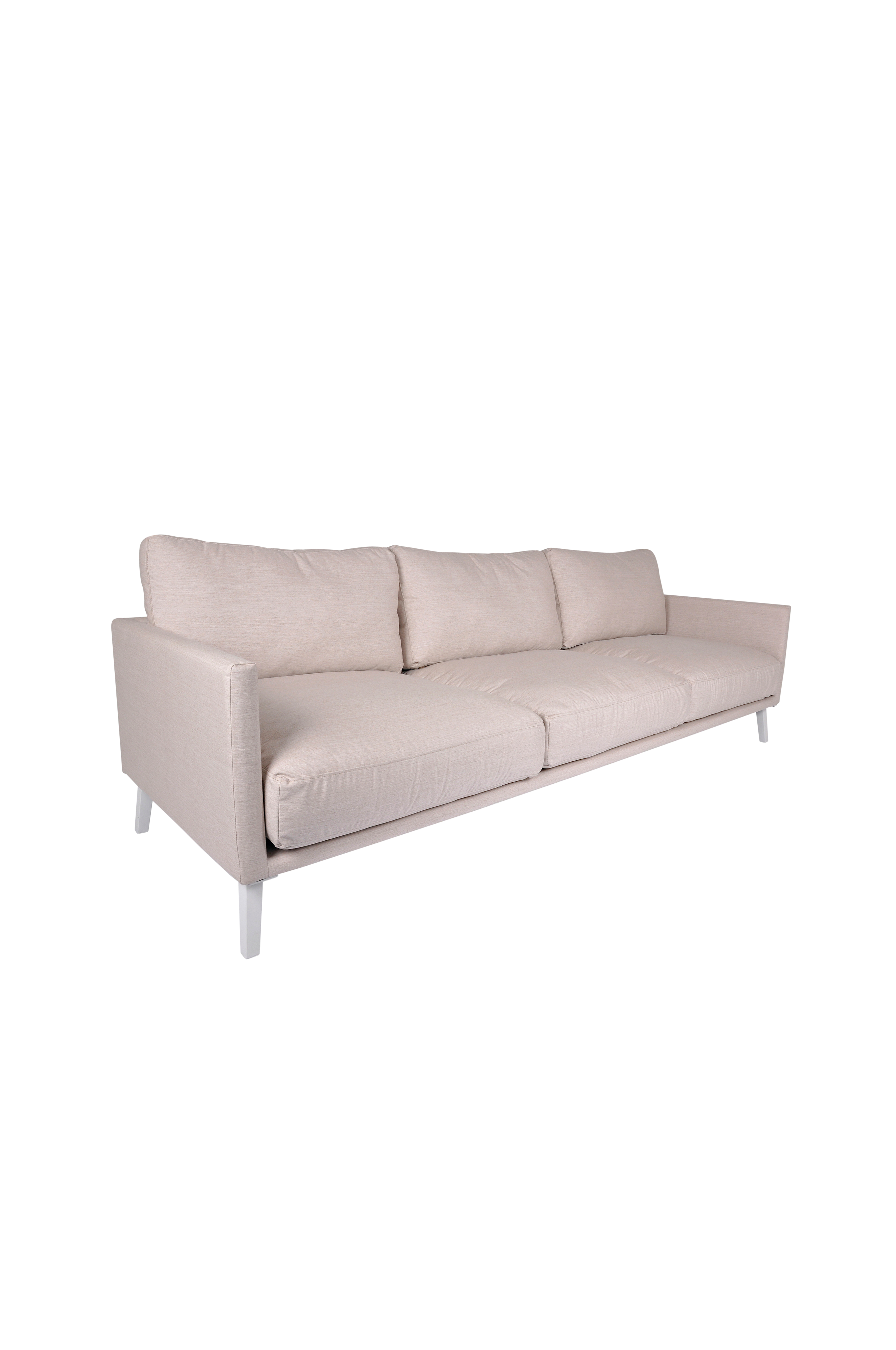 3-seters sofa i Sunbrellas spinnfargede akryltekstil som er vannavstøtende og kan stå ute i både regn og snø. Kan sittes i 30 min etter regn.