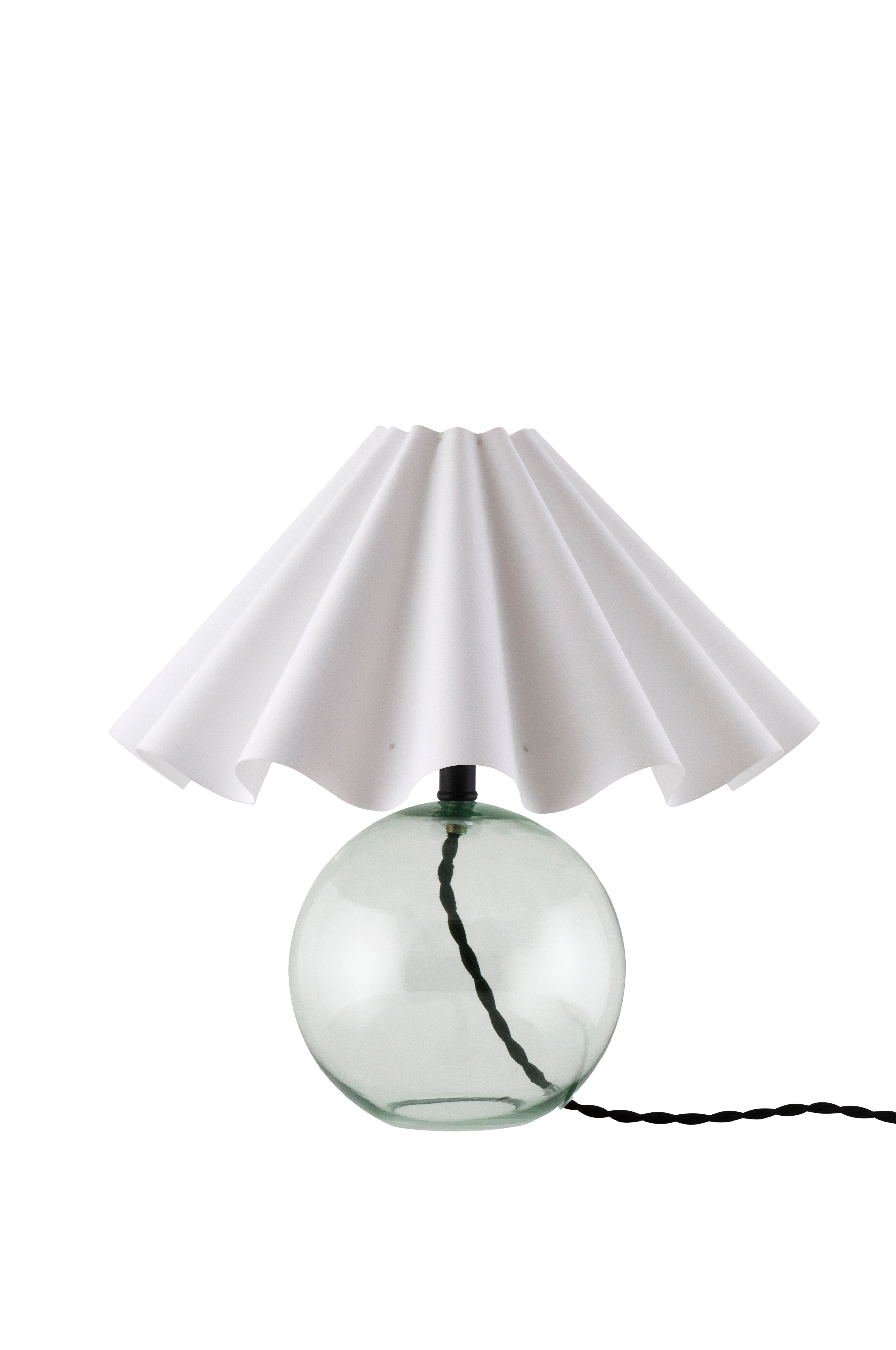 Judith er en klassisk bordlampe med moderne touch. Lampefoten er av tynt glass og har sokkel i metall. Den medfølgende lampeskjermen i tekstil blir en dekorativ detalj med sin bølgende form. Lampen har en 120 cm lang vridd, tekstilkledd ledning med bryter og støpsel. Design: Erika Norén. Bredde 30 cm, dybde 30 cm og høyde 28 cm. Sokkel: 1xE14 Maks 40W. Lyspære ikke inkludert.