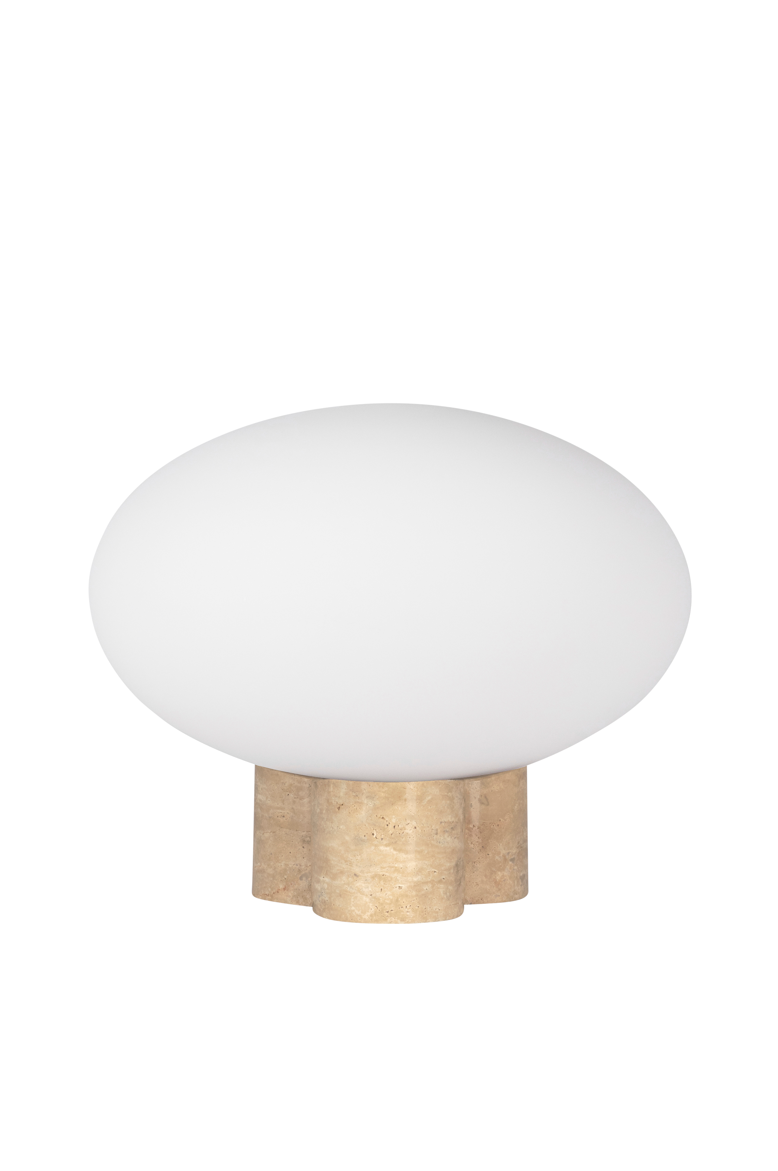 Mammut er en eksklusiv og leken bordlampe med korte ben og stor glasskuppel. Den skulpturale formen gir en robust følelse og et dekorativt utseende. Lampefoten er produsert av polert og solid travertin , noe som er en porøs kalkstein. Lampefoten matcher med en rund matthvit og flat glasskuppel i noe overdimensjonert størrelse, noe som skaper det lekne uttrykket. Mammut har en 200 cm lang transparent ledning med transparent bryter og stikkontakt. Design: GL Design Studio. Lyspære ikke inkludert.