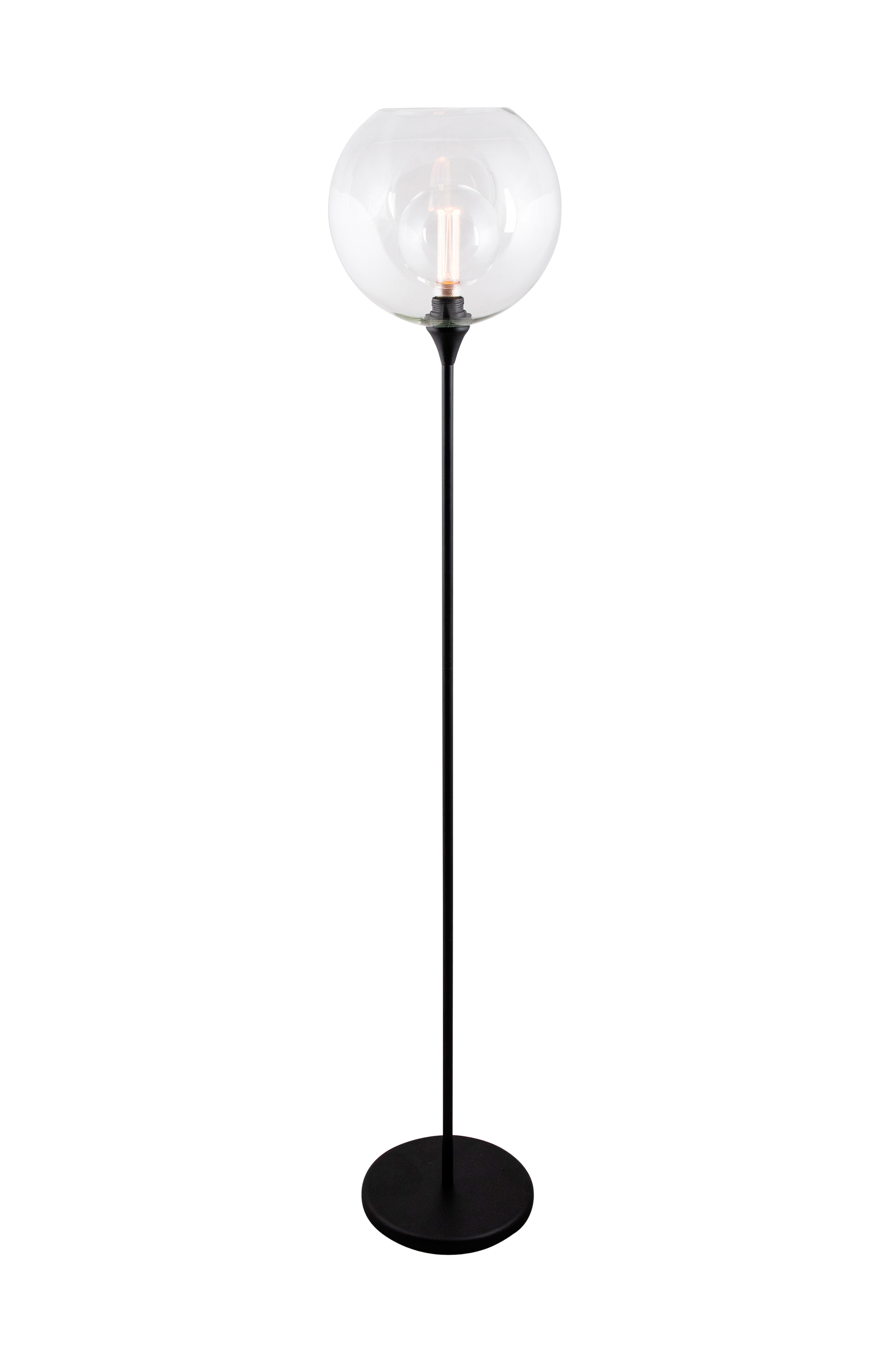 Enkel stilren gulvlampe med kuppel i glass og fot i metall. Lampen har en 200 cm lang transparent ledning med bryter. Bredde: 28 cm. Dybde: 28 cm. Høyde: 150 cm. Sokkel: 1 x E27, maks 60W. Anbefalt lyskilde: E112 (medfølger ikke)
