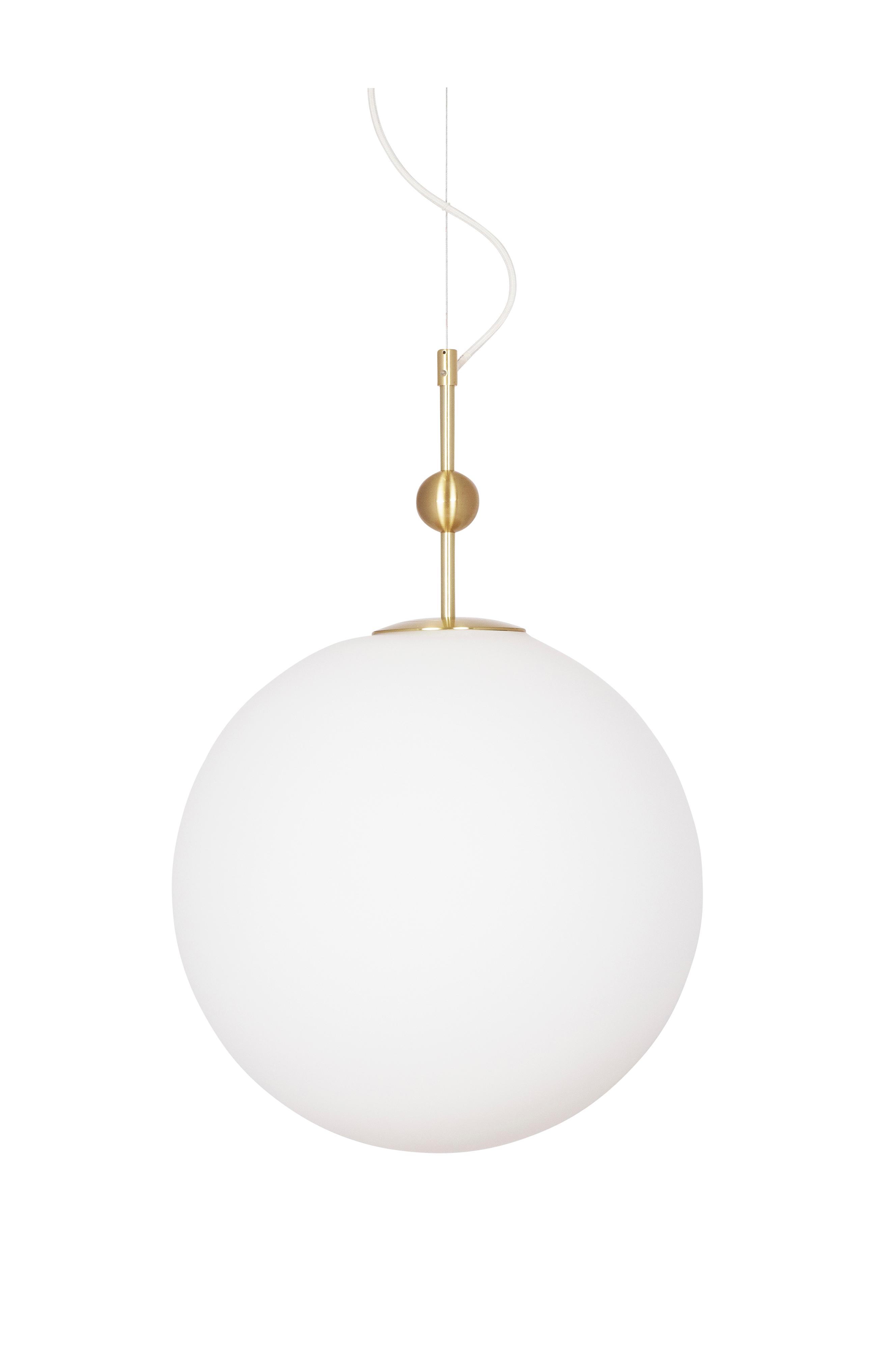 Astrid er en klassisk pendel med matt glass og børstet metall. Lampen har en 120 cm lang tekstilkledd ledning med vaier og takkopp. Design: GL Design Studio. Bredde 40 cm, dybde 40 cm og høyde 60 cm. Sokkel: 1 x E27 Maks 60W. Lyspære ikke inkludert. Ikke jordet.