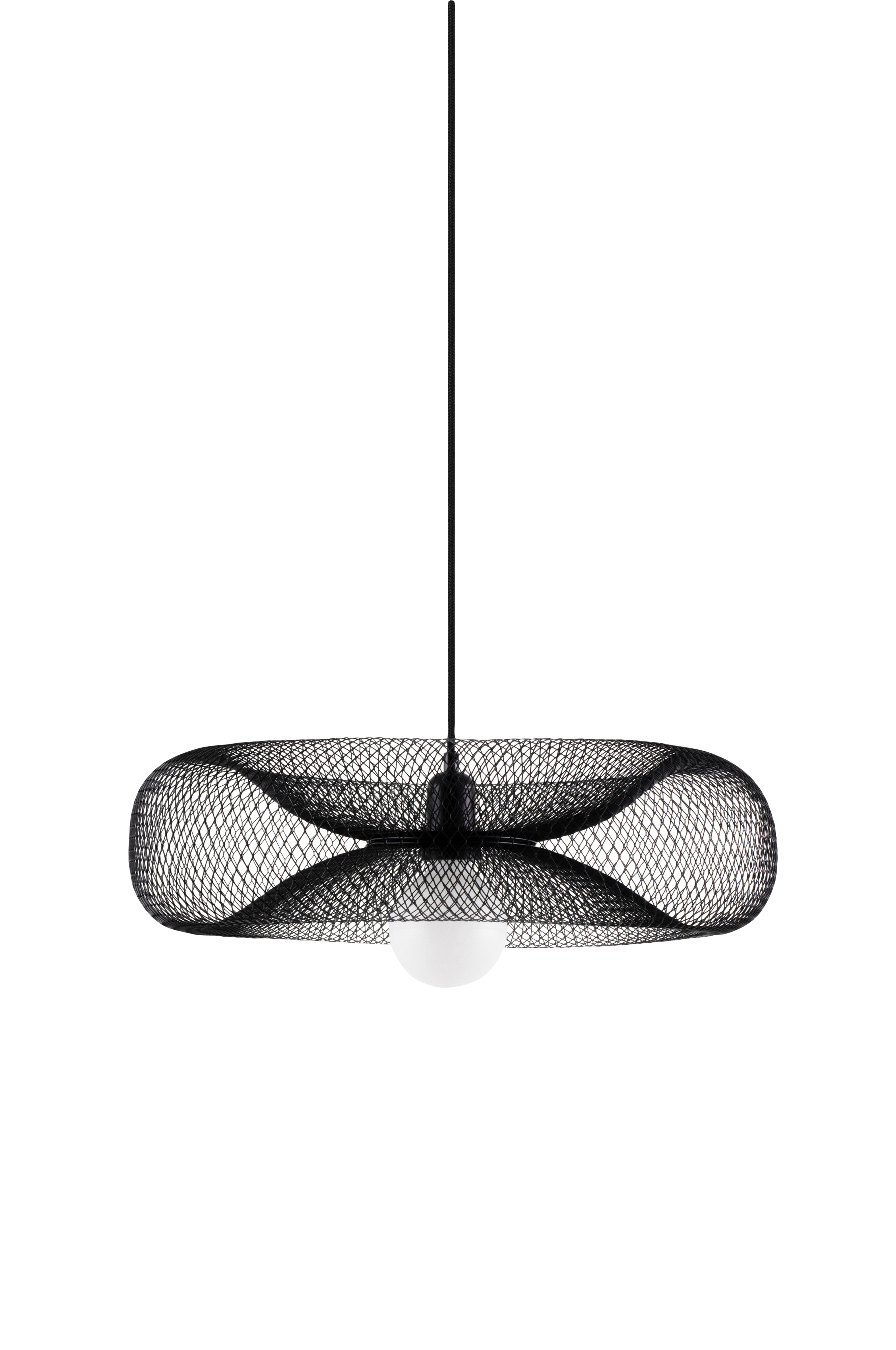 Torus er en luftig og myk pendel produsert av galvanisert metallnetting. Lyset reflekteres fint i den blanke overflaten, velg selv hvilket uttrykk lampen skal ha avhengig av hvilken lyskilde du bruker. Lampen har en 120 cm lang tekstilkledd ledning samt matchende takkopp av metall. Takkobling ikke inkludert.