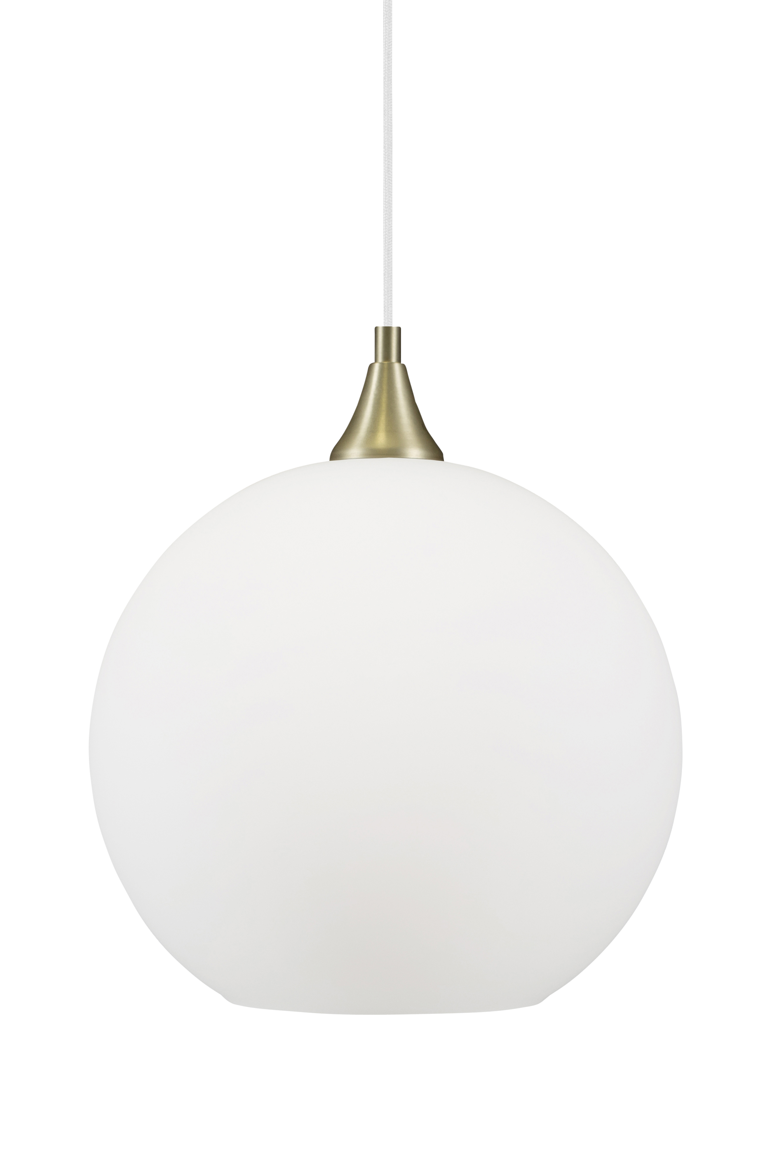 Pendel i opalisert hvitt glass med detaljer i børstet messing. 120 cm svart tekstilledning med takkopp. Diameter 28 cm, høyde 32 cm. Sokkel E27, maks 60W.
