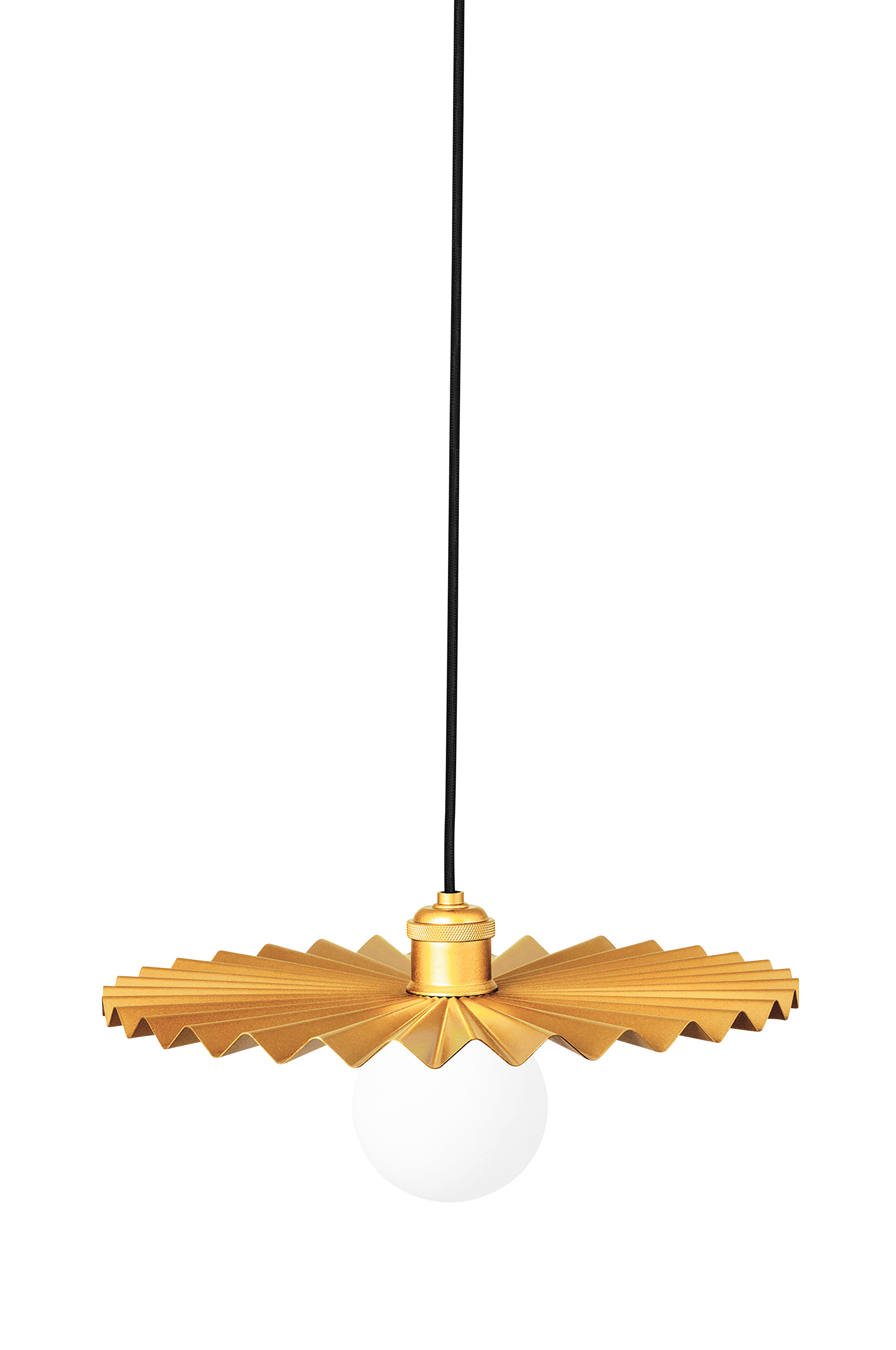 Omega taklampe med foldet metallskjerm i mattsvart tar for seg og skiller seg ut i rommet. Like fin alene som sammen med flere. Omega har en 120 cm lang svart tekstilledning og takkopp i svart plast. Design, GL Design Studio. Bredde 35 cm, dybde 35 cm og høyde 6 cm. Lampesokkel 1xE27. Maks 60 W. Lyspære er ikke inkludert.