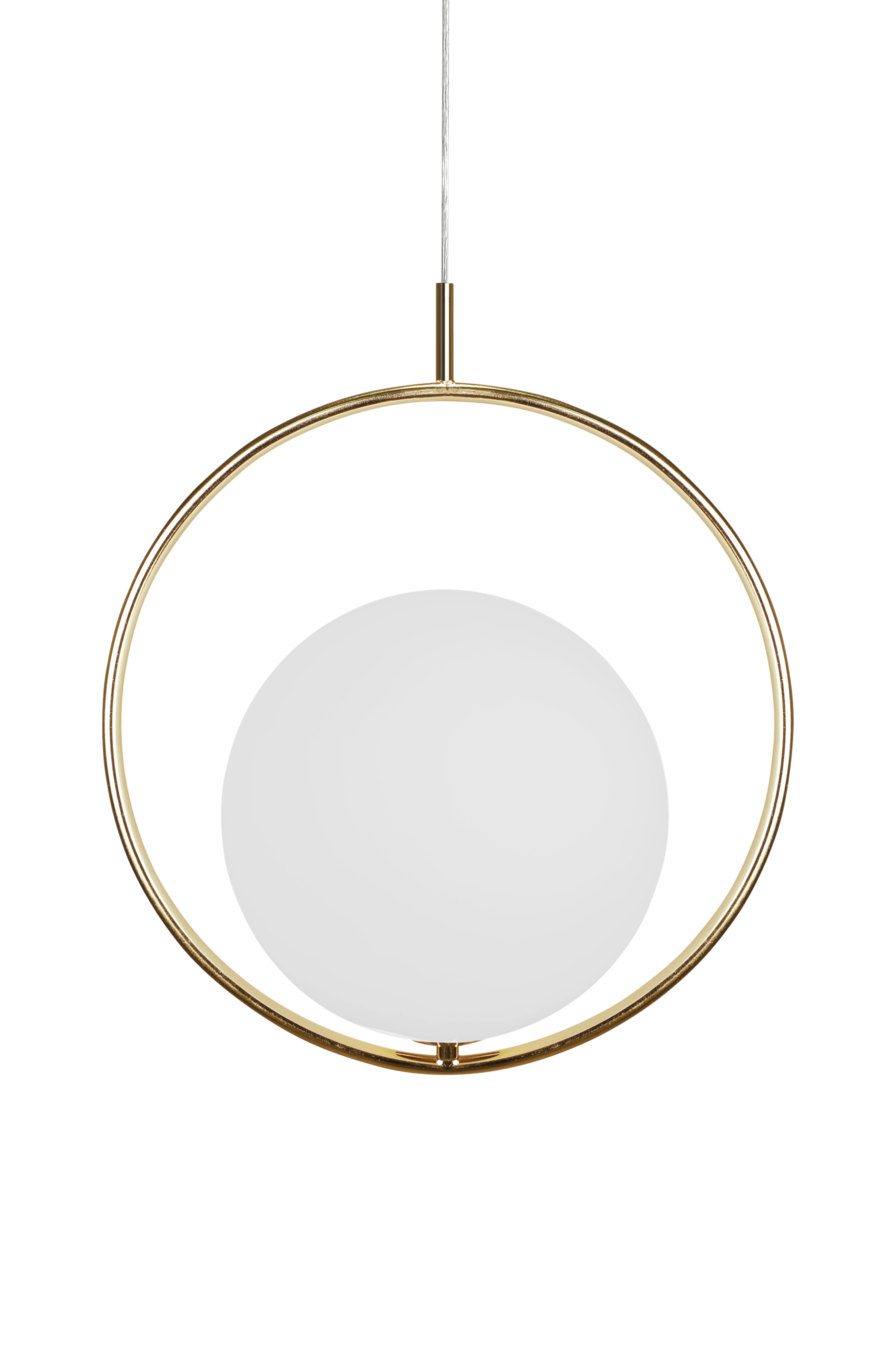 Taklampe Saint hadde enkelhet som inspirasjon. Ringen i metall med en svevende hvit glasskule inni. Store og forseggjorte detaljer tvers gjennom. Transparent ledning med takkopp i metallfarge. Høyde 45 cm. Bredde 26 cm. Dybde 40 cm.