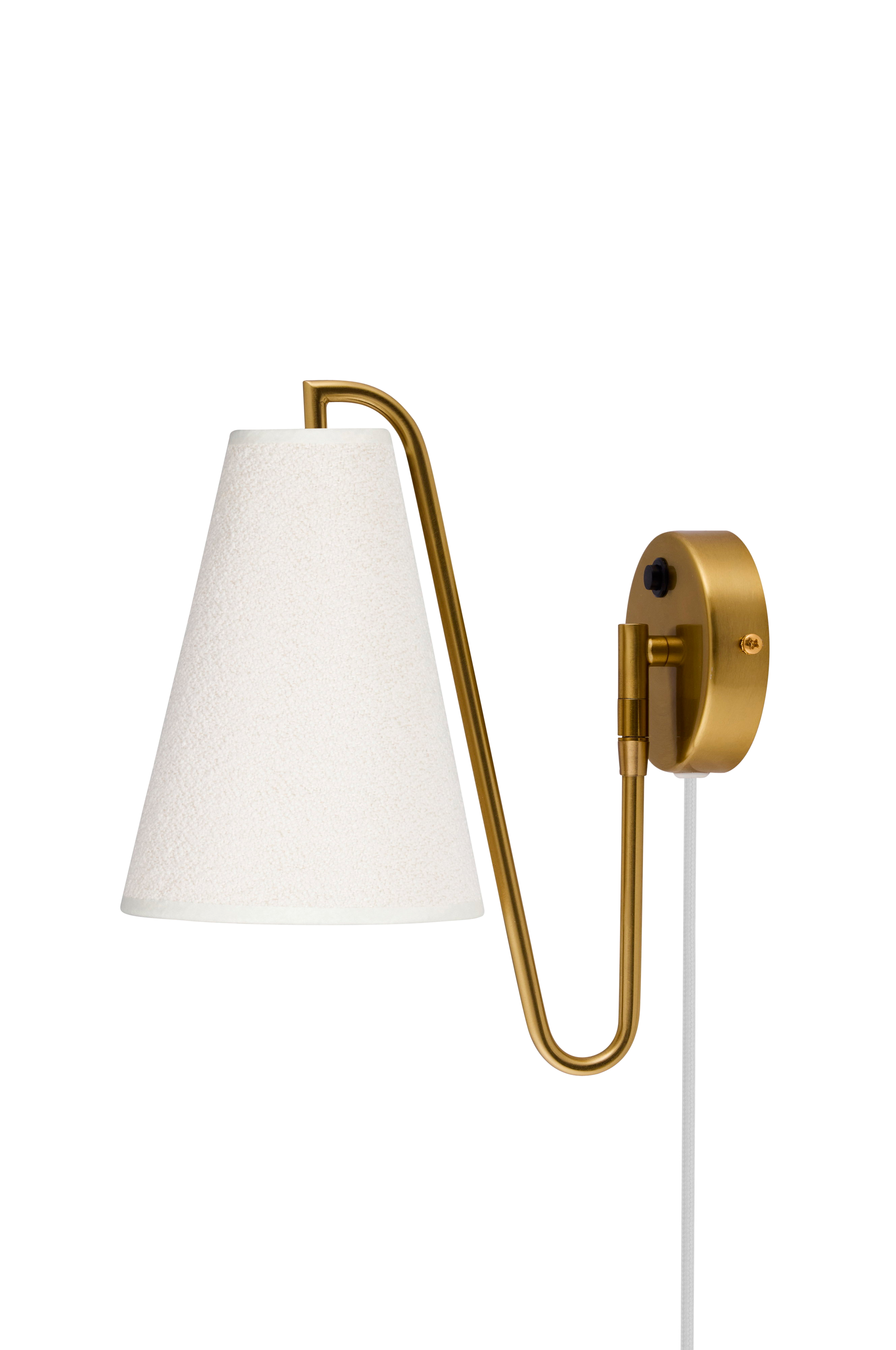 Lou er en funksjonell og dekorativ vegglampe med et bevegelig ledd og en lampeskjerm i bouclé-stoff. Metallet og det strukturerte stoffet gir et mykt og moderne uttrykk. Lampen har en 200 cm lang tekstilkabel og en bryter på armaturen. Lou er en allsidig lampe som passer inn i mange ulike miljøer og kan enkelt brukes til fast montering om ønskelig. Lampen er kompatibel med dimmer, og lyskilde medfølger ikke.