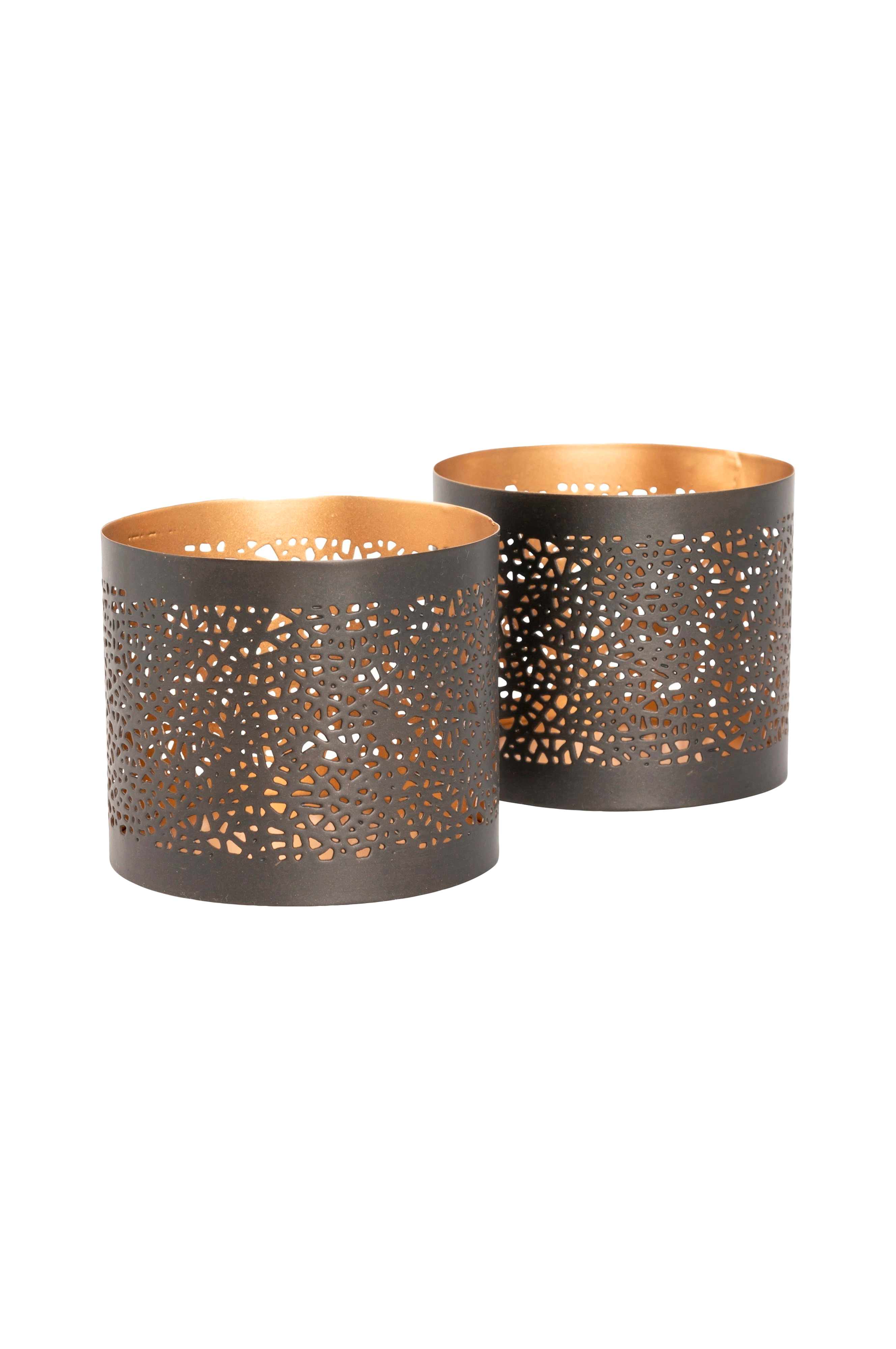 Sett med to telysholdere i metall med et vakkert perforert mønster, levert i en elegant gaveeske.