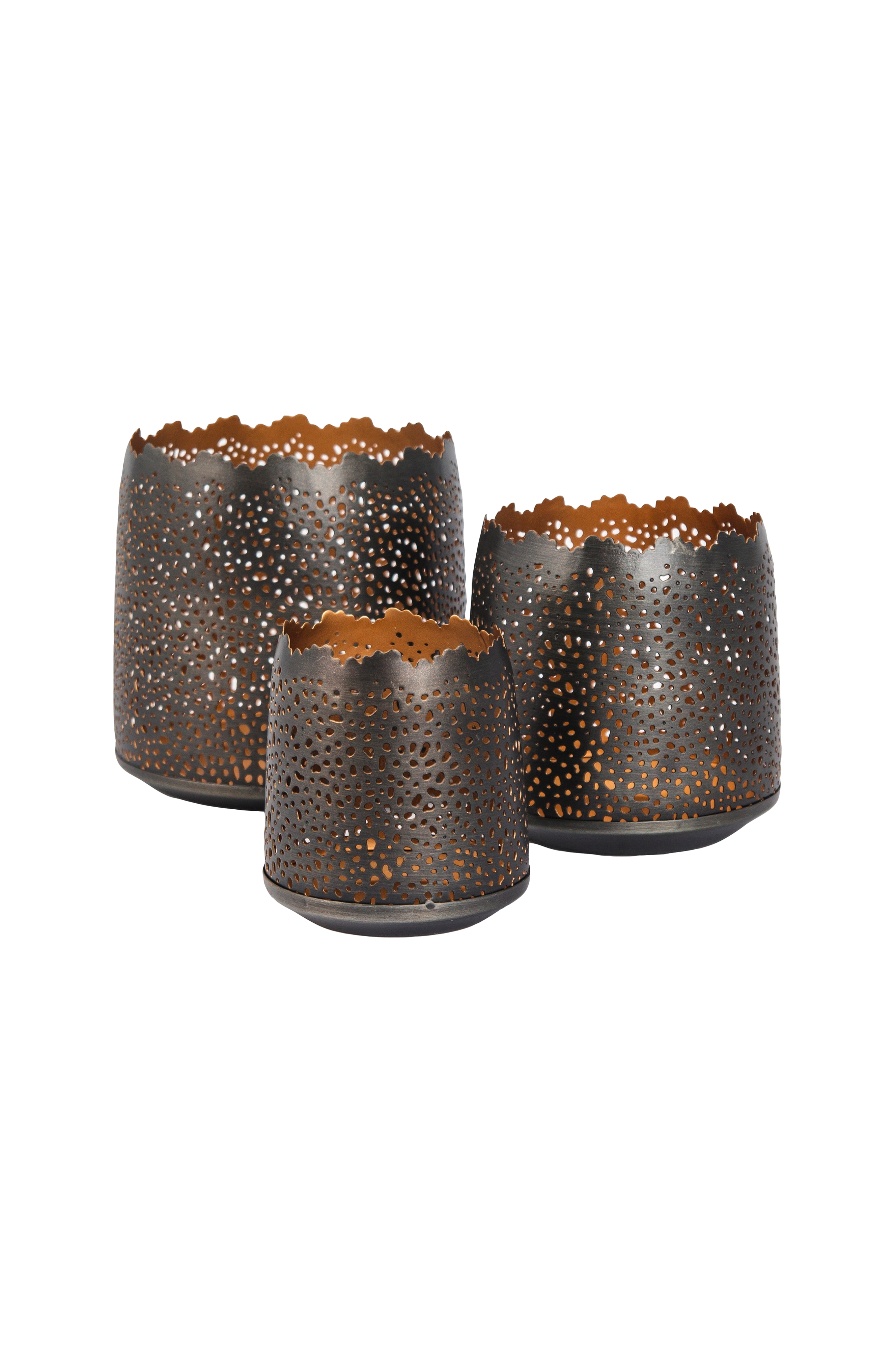 Lykter i skifergrått, patinert metall med gullfarget innside og et perforert mønster som skaper vakkert lys i mørket. leveres i gaveeske, lyktene er en del av halvor bakkes kolleksjon