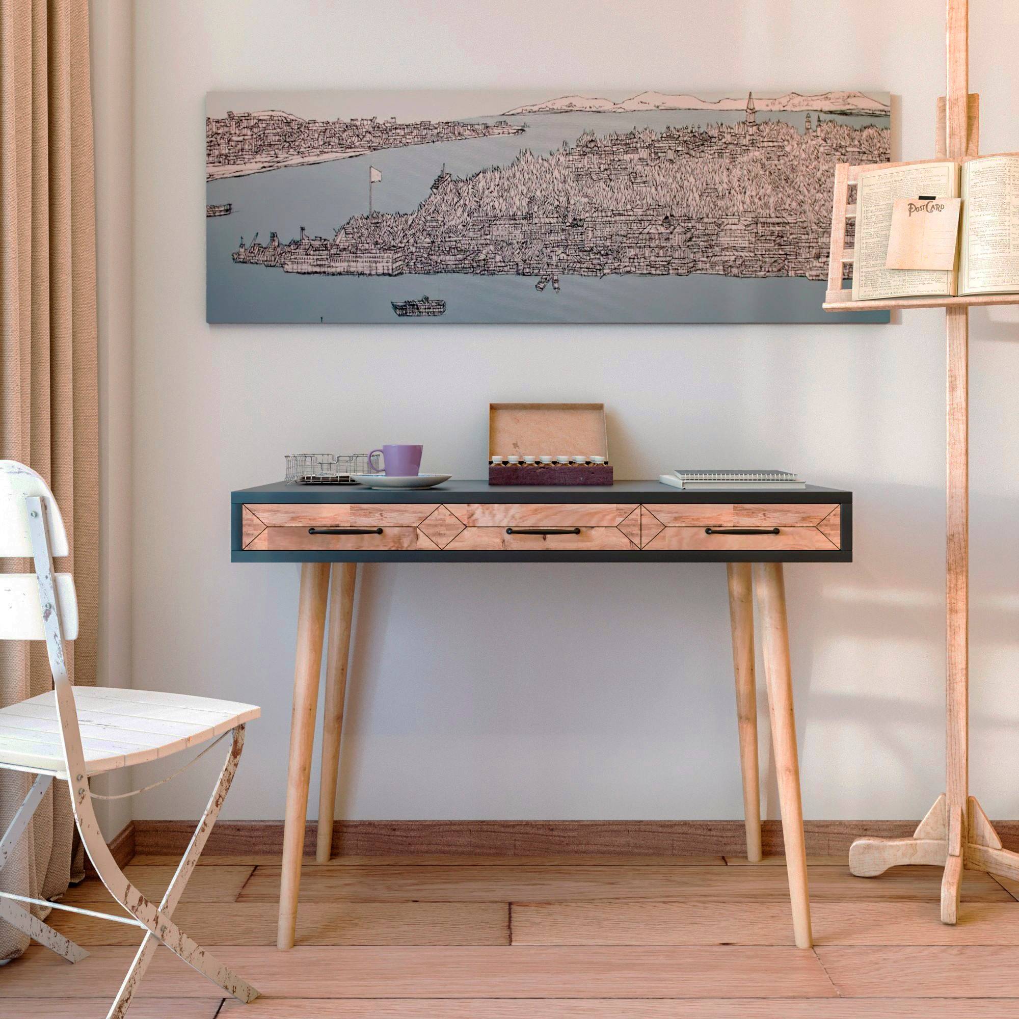 Det er et pent skrivebord, men det står ujevnt, og 'wobbler' Selve produktet er omtrent, men treet på beina er forskjellig fra det på skuffene