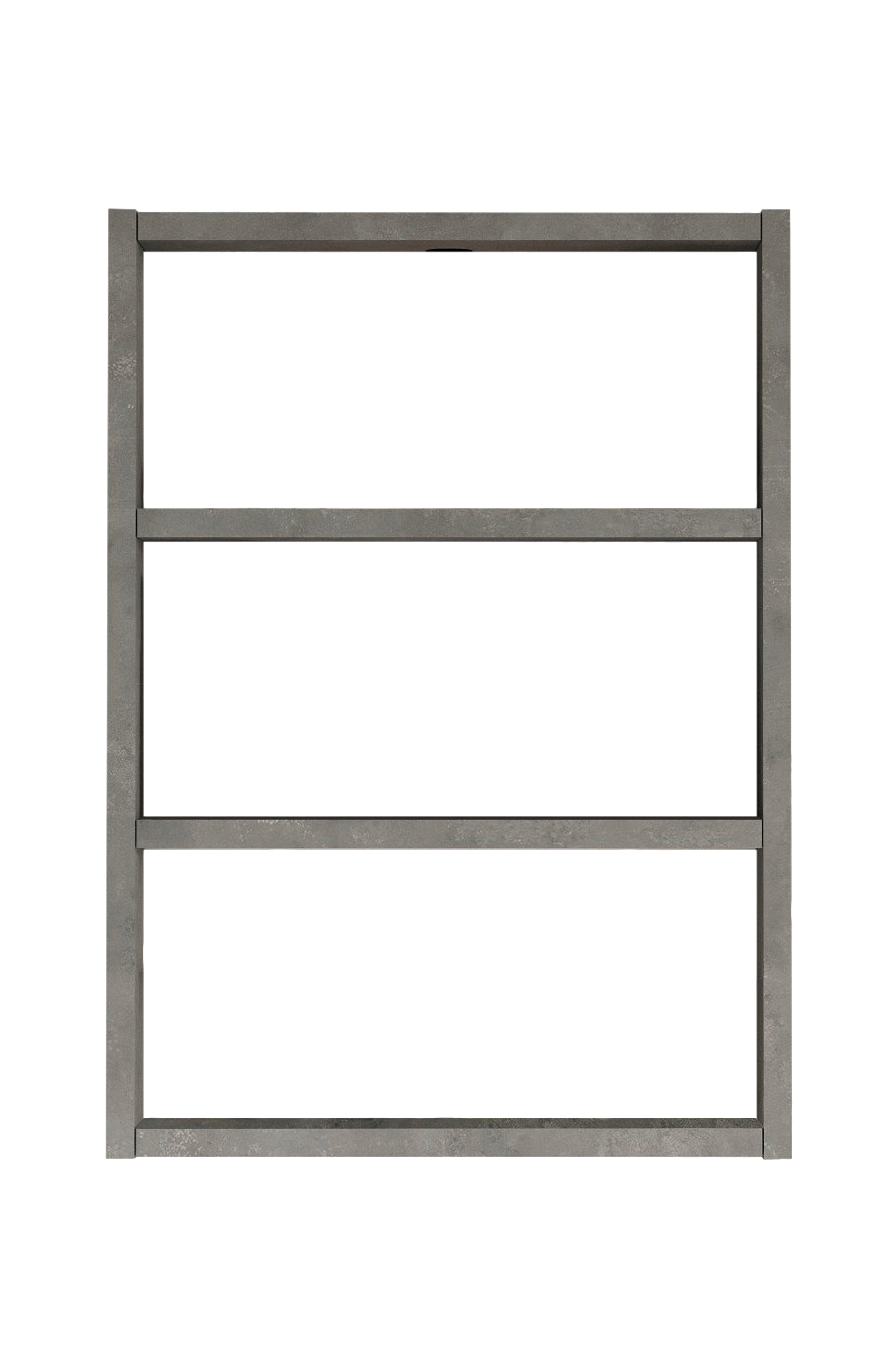Hyllen har synlige metallskruer på sidene for hver hylle som ikke er vist på bildene. Skruehullene i selve hyllen er forboret ujevnt.